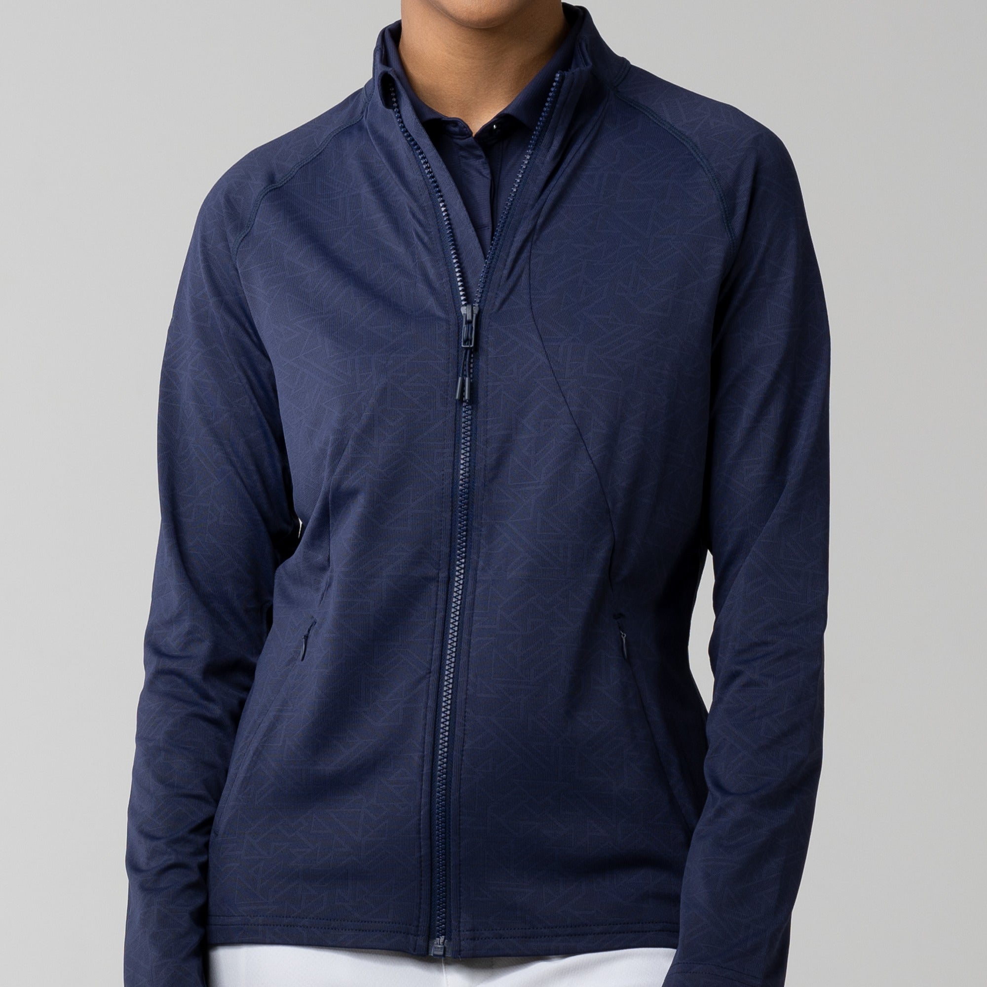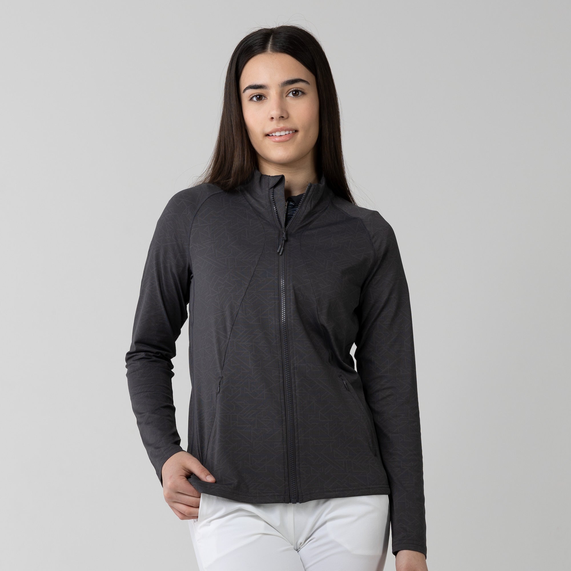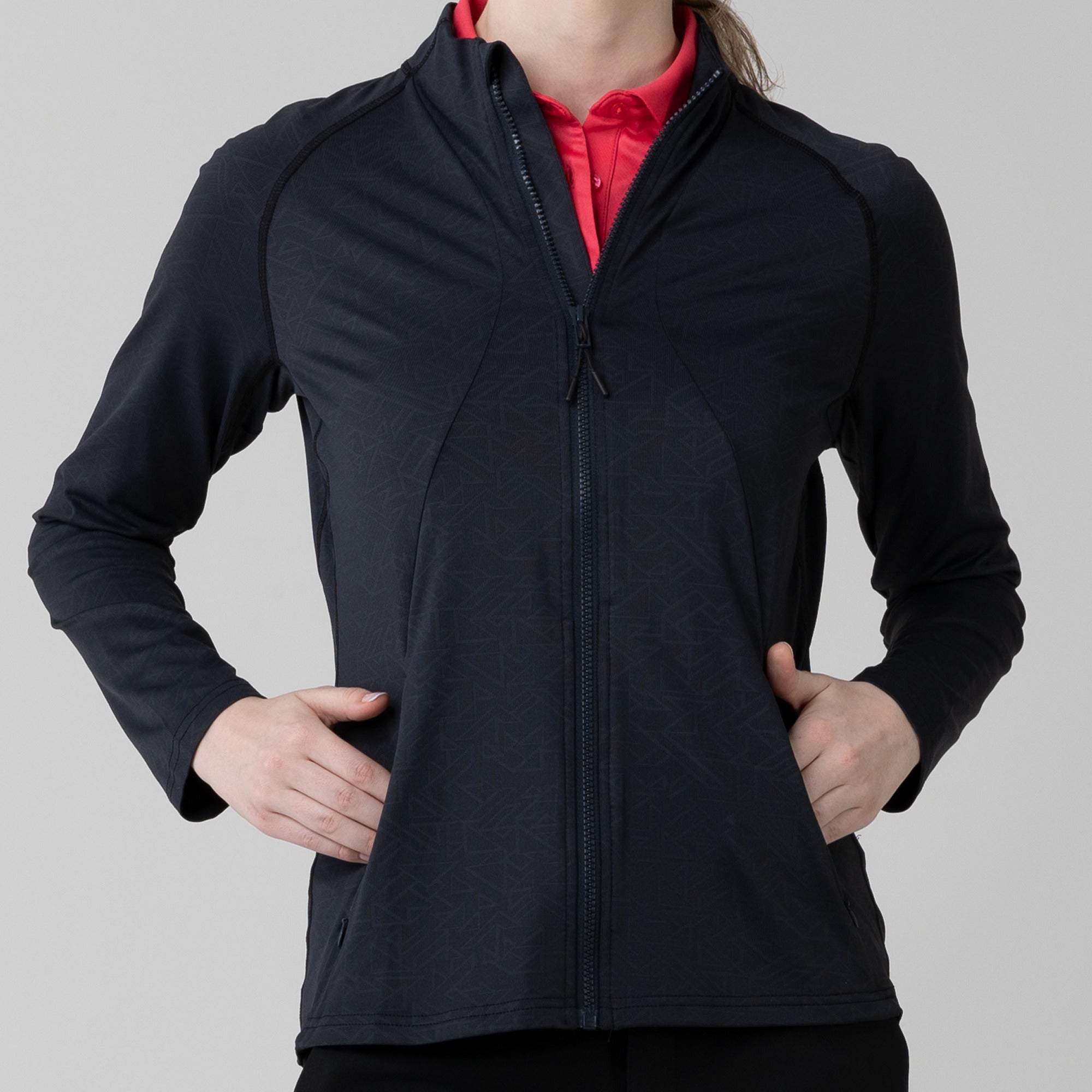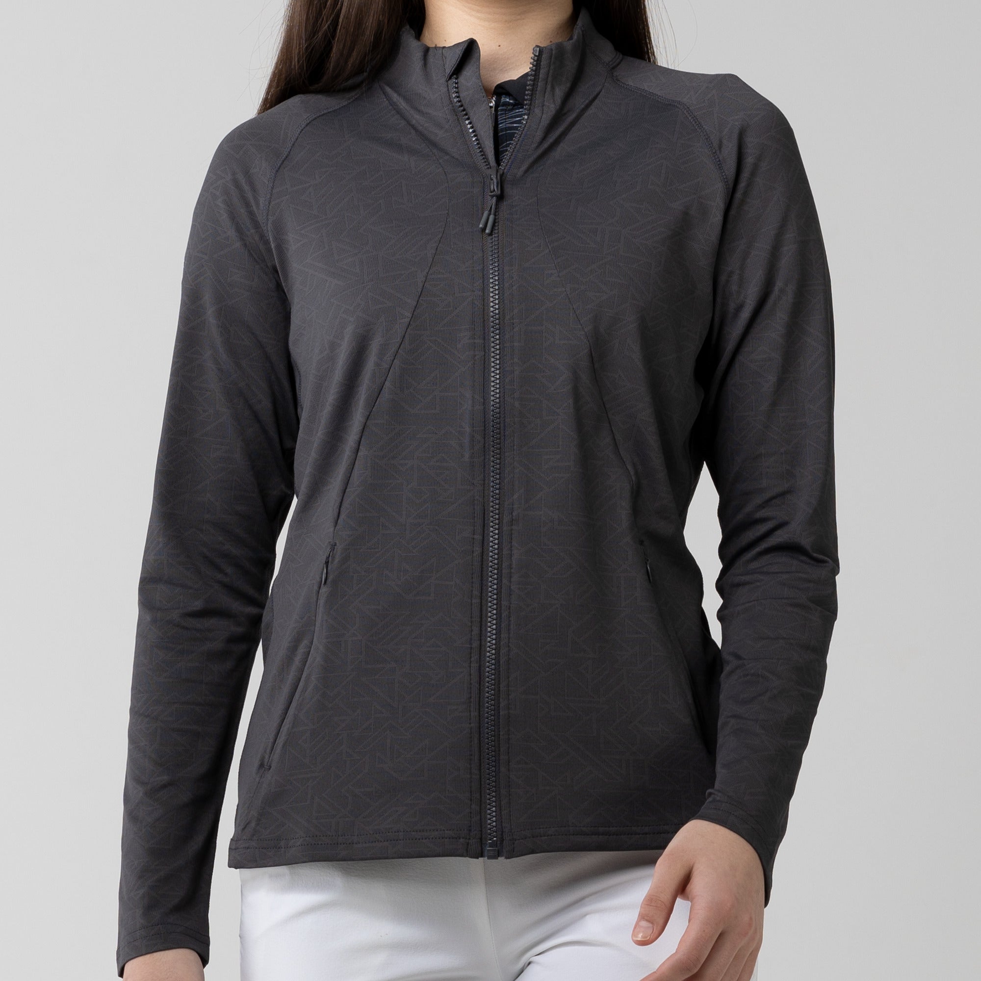 This full zip jacket features an allover geometric print that takes your look to new heights. Stylistic detail is matched with functional design features that keep you golfing at your very best. This jacket is moisture wicking, anti-static, and has zippered side pockets that store your belongings safely.