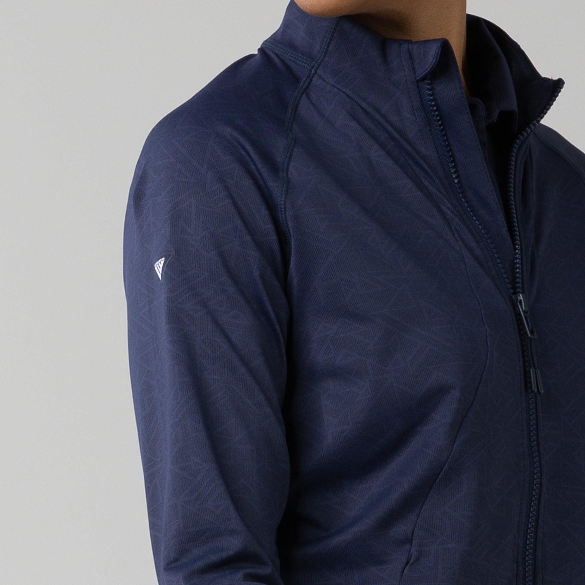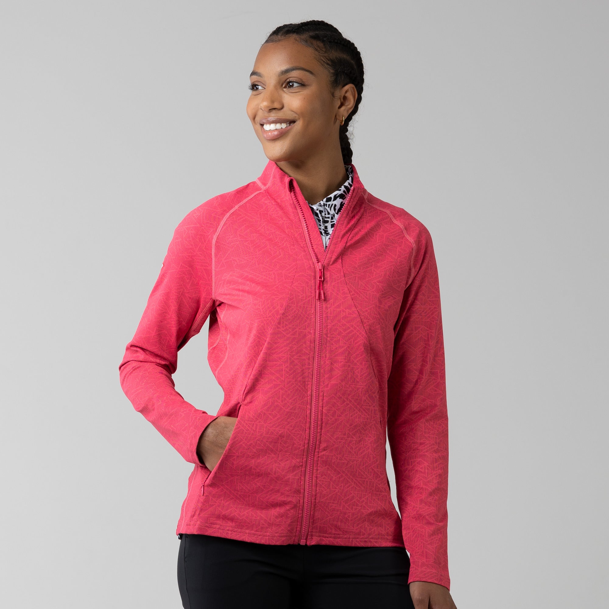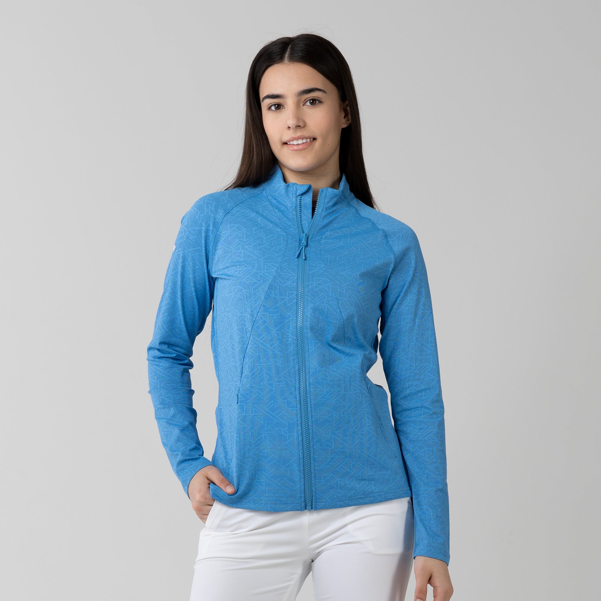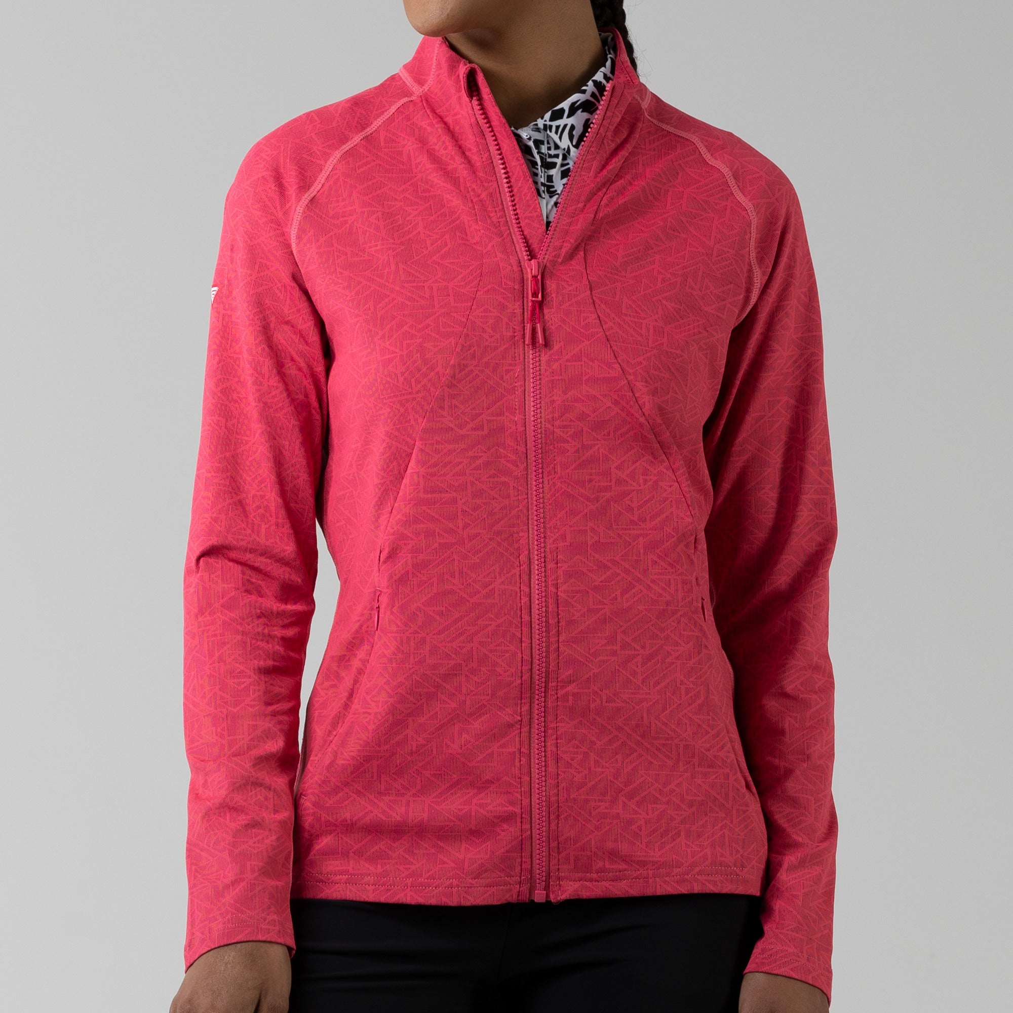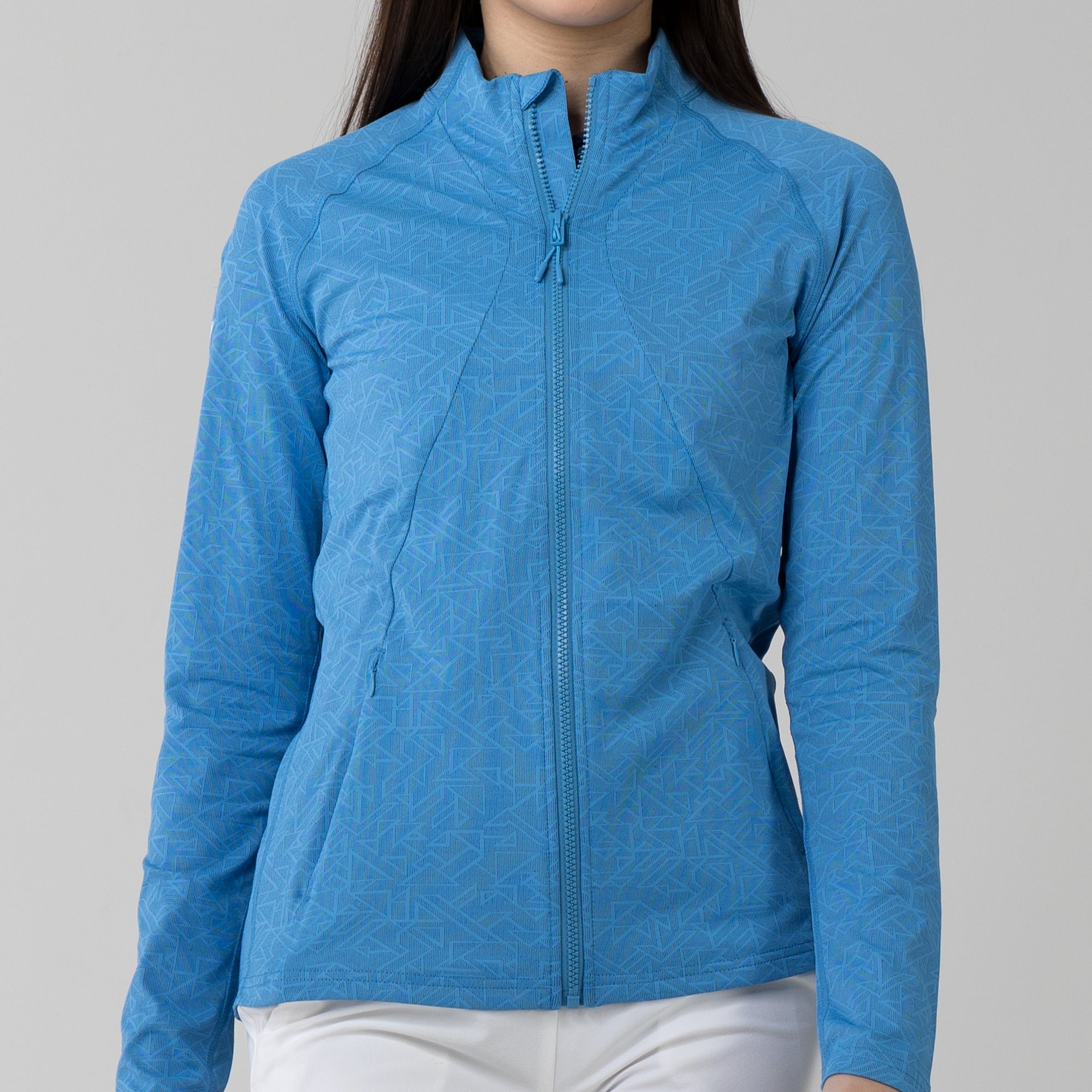This full zip jacket features an allover geometric print that takes your look to new heights. Stylistic detail is matched with functional design features that keep you golfing at your very best. This jacket is moisture wicking, anti-static, and has zippered side pockets that store your belongings safely.