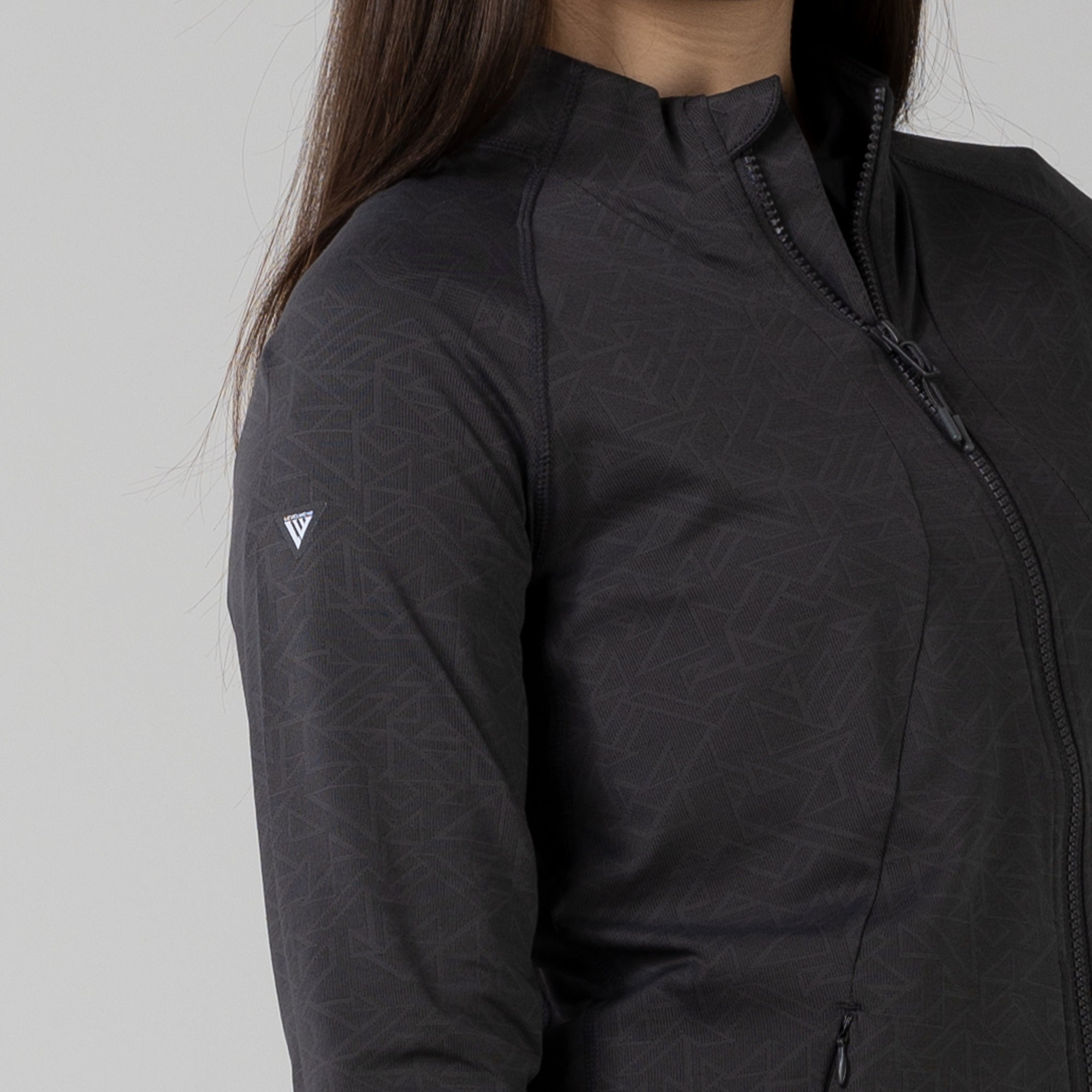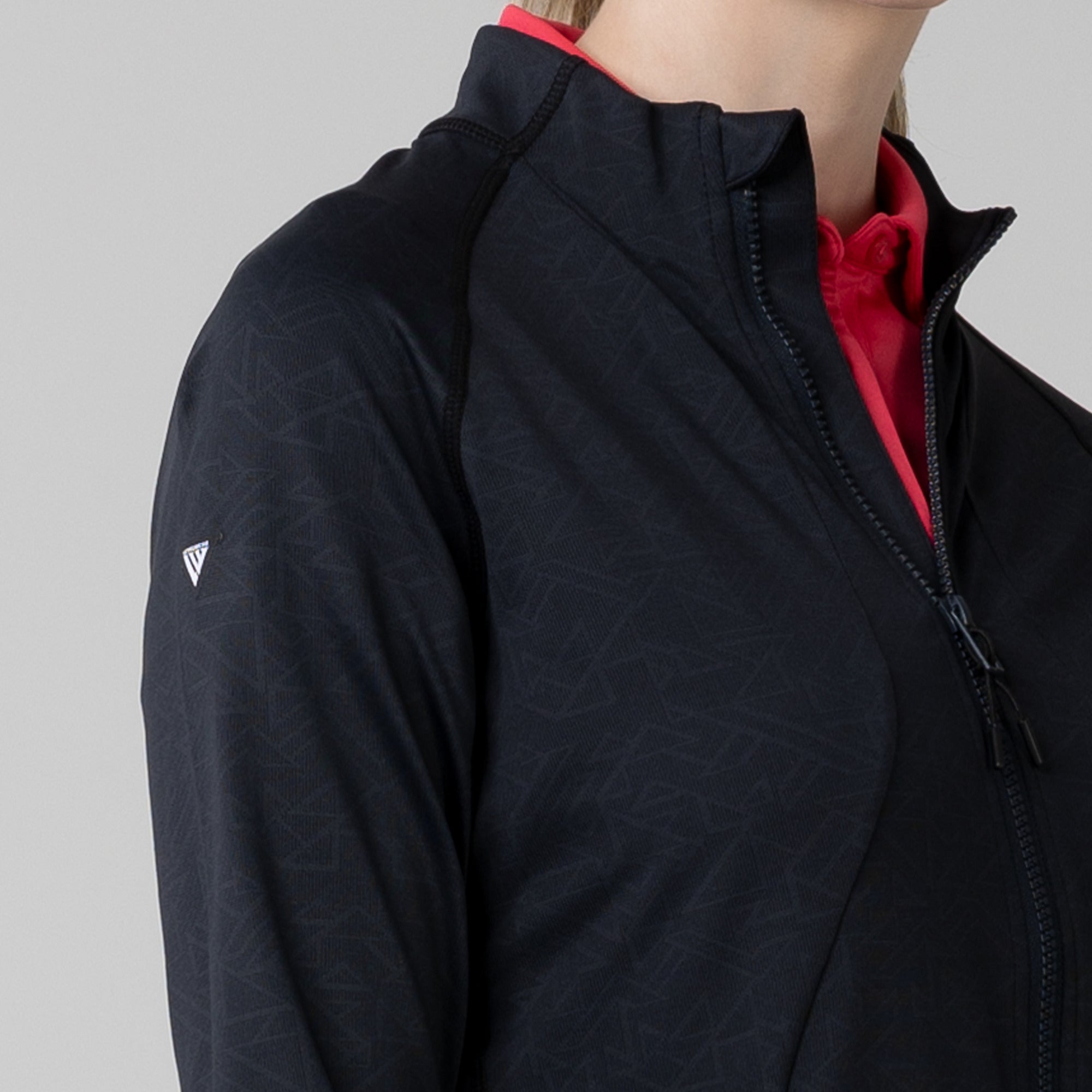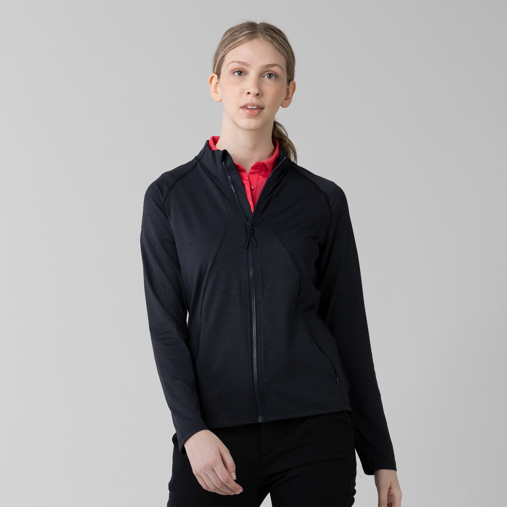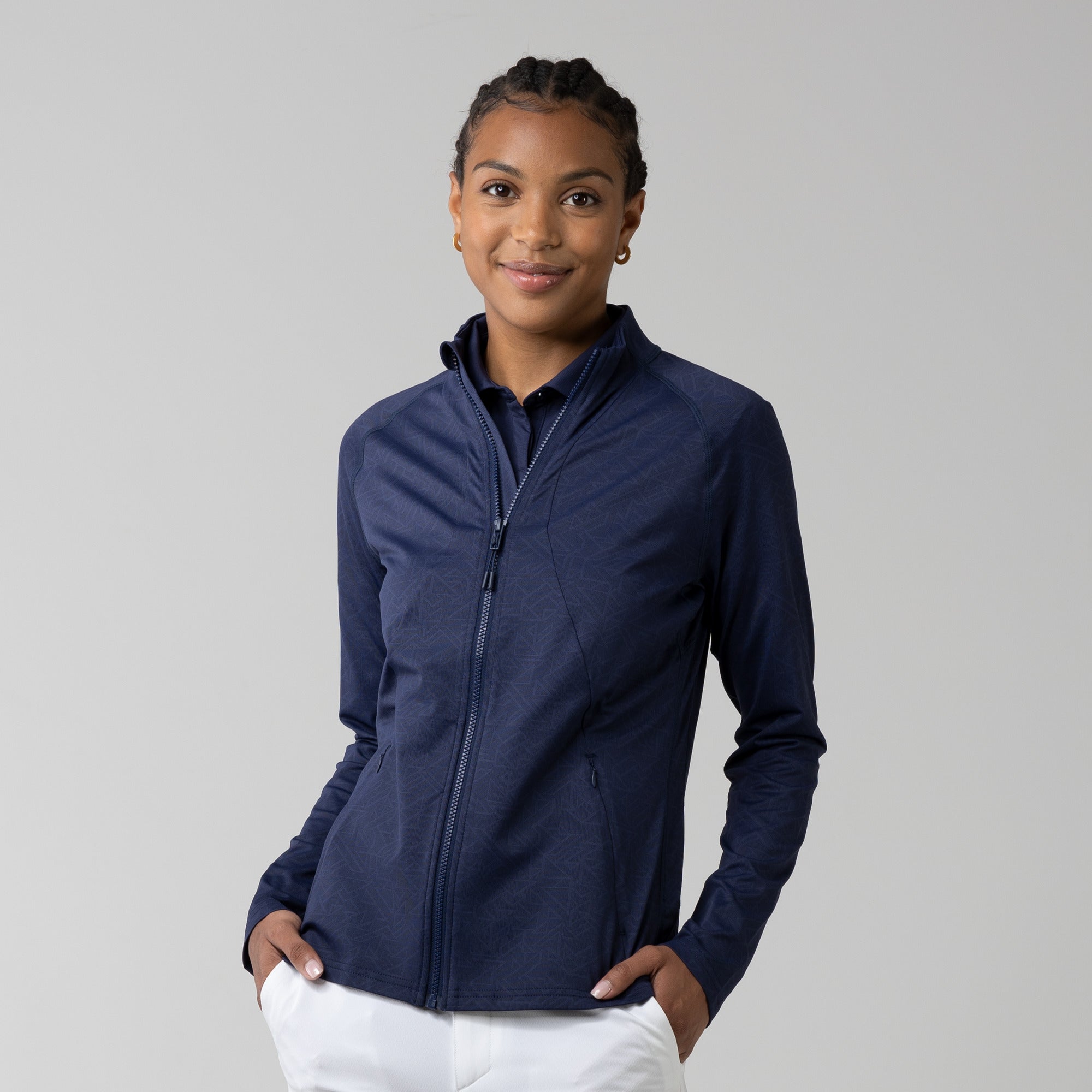 This full zip jacket features an allover geometric print that takes your look to new heights. Stylistic detail is matched with functional design features that keep you golfing at your very best. This jacket is moisture wicking, anti-static, and has zippered side pockets that store your belongings safely.