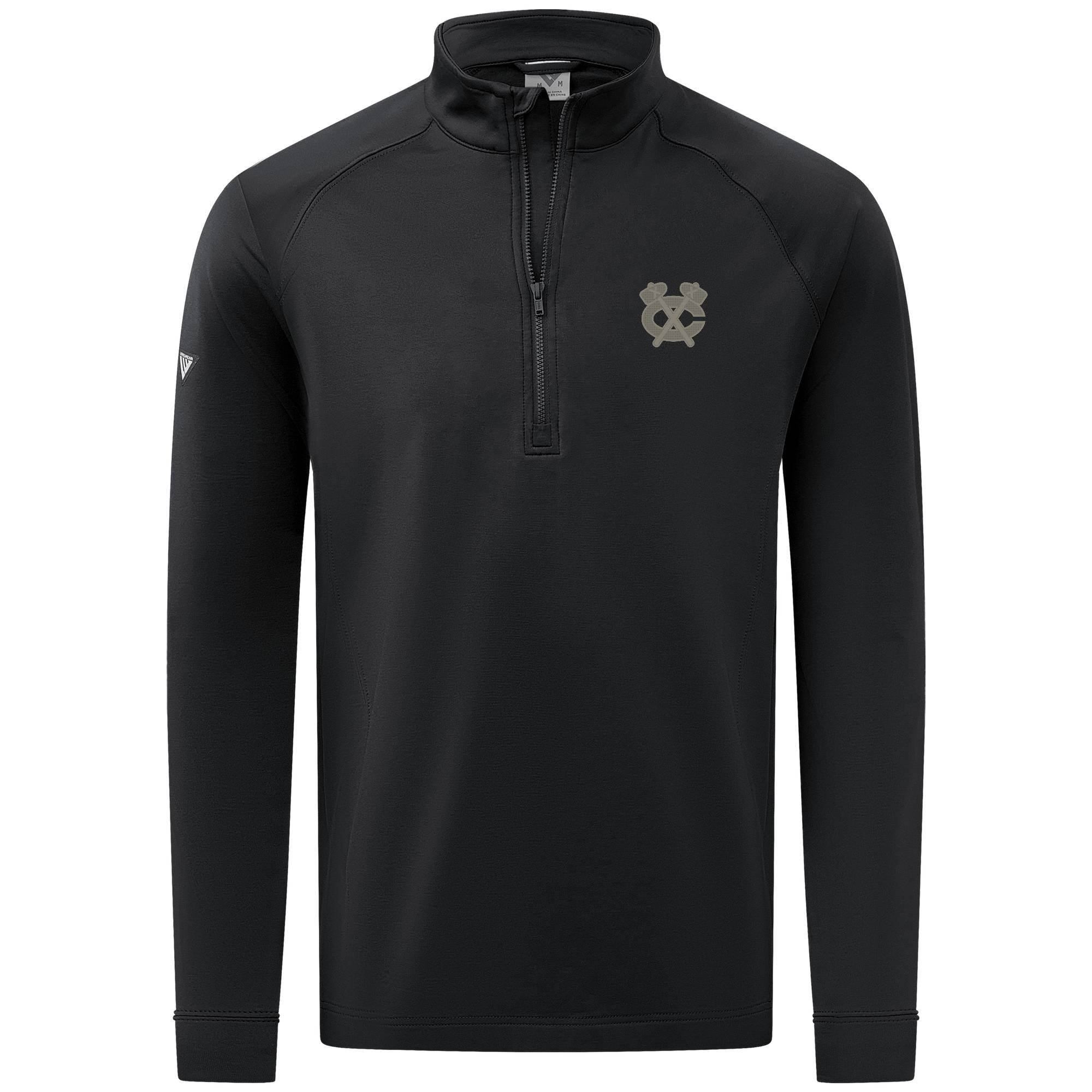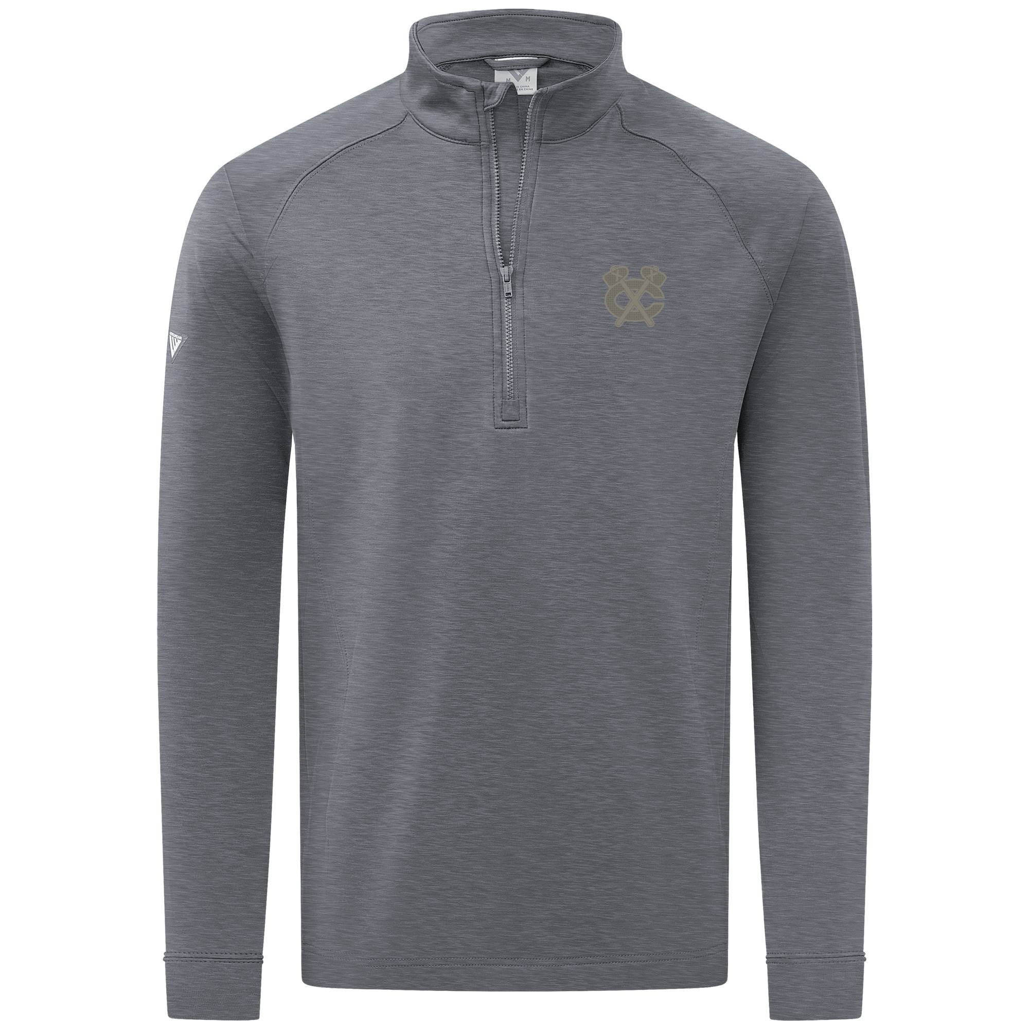Experience the unexpected warmth of the Calibre mid-layer, a men's mid-weight quarter-zip pullover that combines enhanced functionality with refined simplicity. This garment features a mock neck topped with a durable vislon zipper and is crafted with raglan sleeves to facilitate unrestricted movement. The interior is brushed for a supremely comfortable feel. It is tailored with banded cuffs for a snug fit, engineered side panels for a streamlined look, and underarm perforated venting holes for optimal breathability, ensuring that it keeps you warm without sacrificing comfort or mobility.