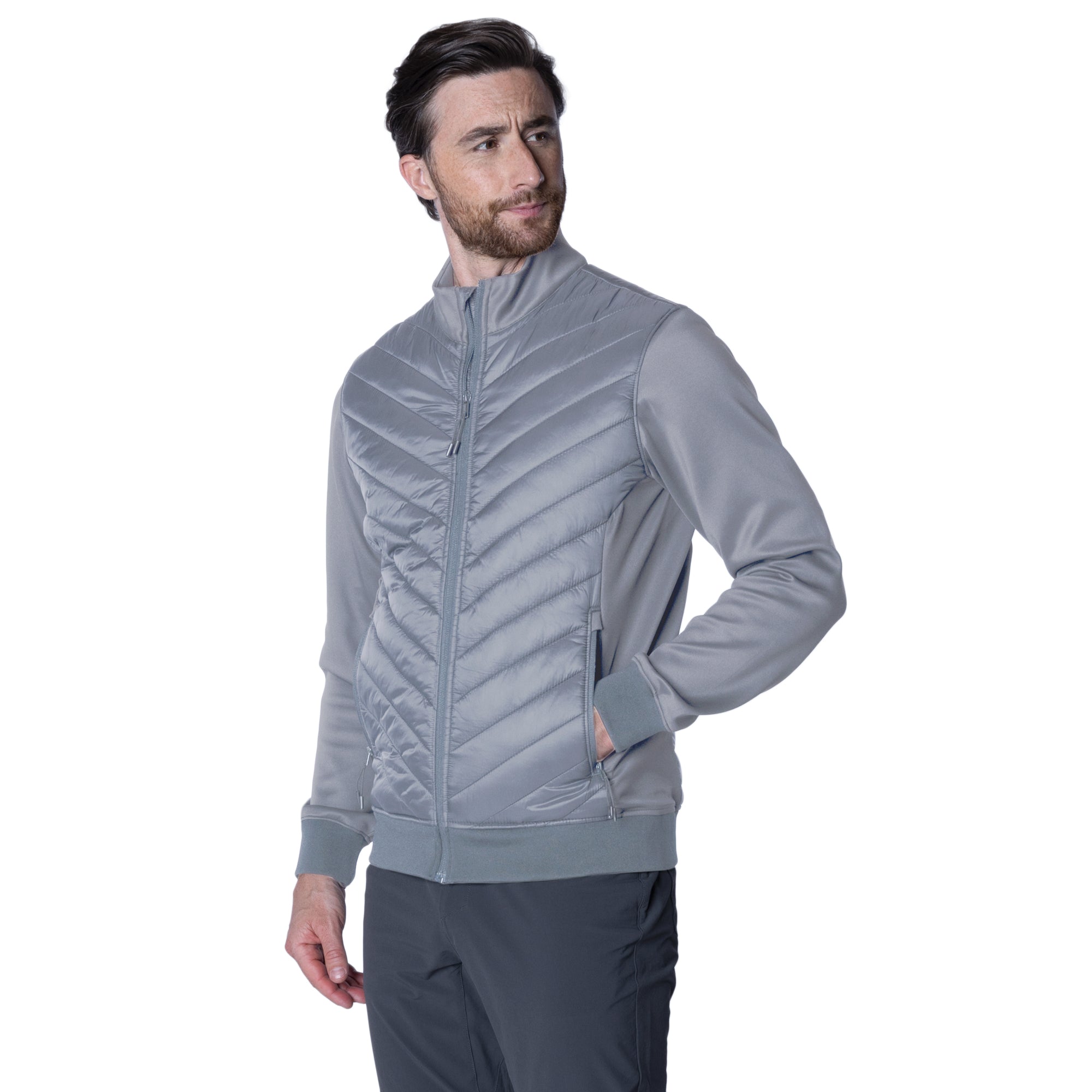 The Men's Micro Jacket is meticulously designed to offer style, comfort, and protection in cooler climates. This lightweight, quilted jacket is crafted from 100% nylon with a 100% polyester fill, providing excellent insulation while remaining light and easy to move in. Featuring a water-repellent finish, it stands up to unpredictable weather, ensuring you stay dry. The diagonal quilting pattern not only adds a modern aesthetic but also enhances the jacket's structure for improved warmth. Contrast knit fabric sleeves and side panels offer a dynamic look and increased mobility, making this jacket as functional as it is fashionable. Additionally, zippered side pockets provide secure storage for essentials, while the ribbed bottom hem and cuffs ensure a snug fit that keeps the cold out. Whether you're navigating the city or embarking on an outdoor adventure, the Micro Jacket is an ideal choice for staying warm and stylish.