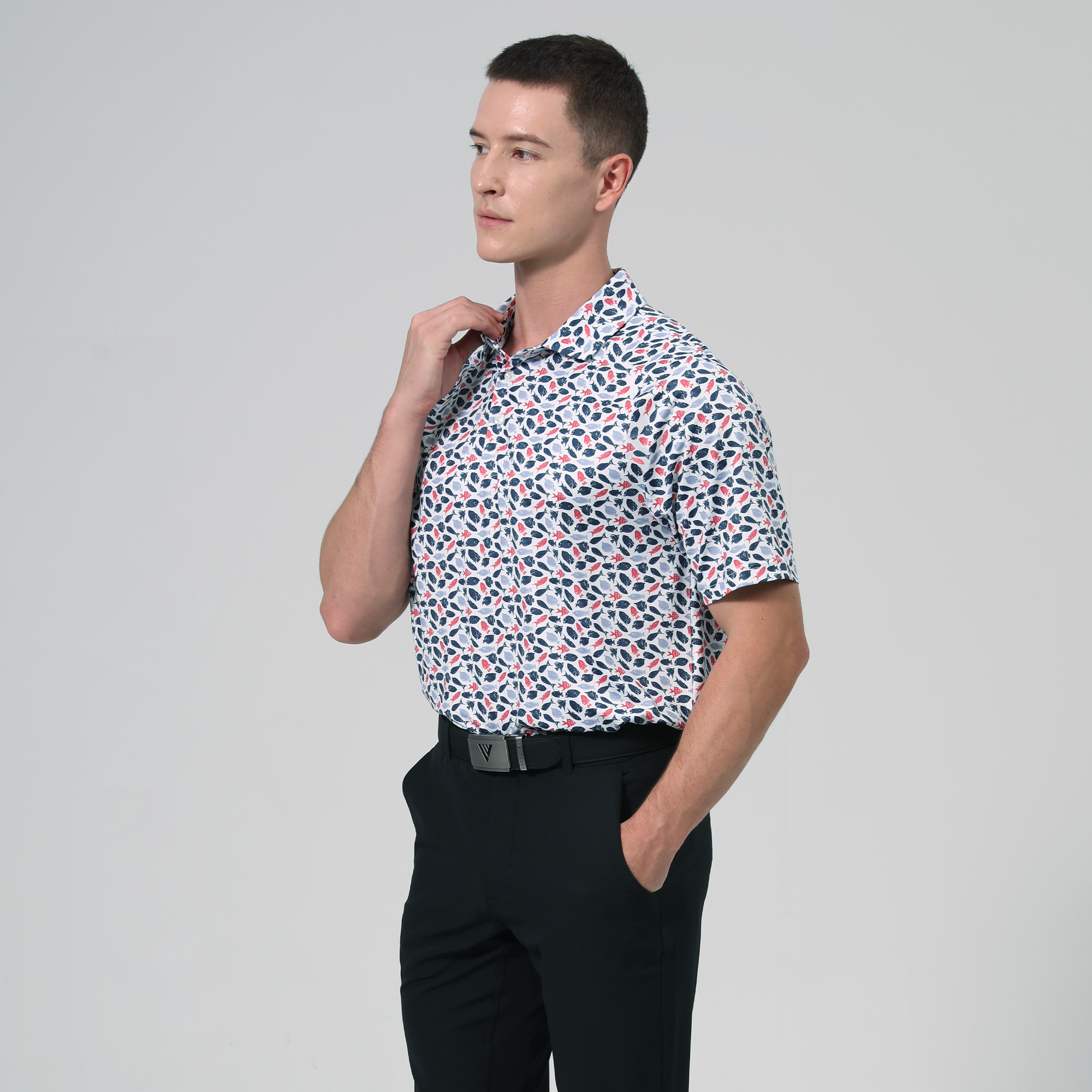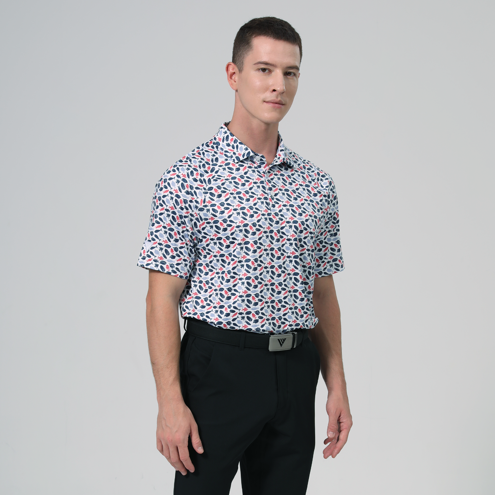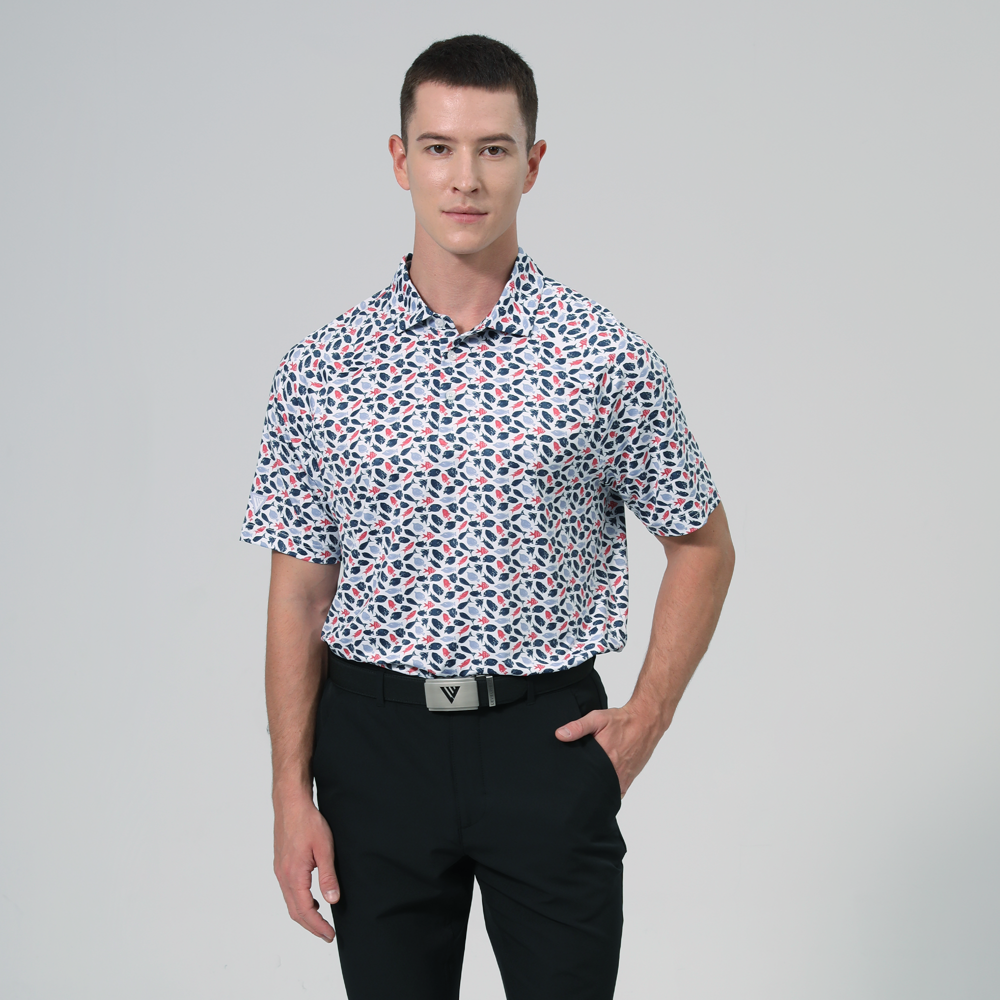 Made with moisture-wicking fabric, the Aquarium polo will keep you cool and dry during every round, while an anti-bacterial finish ensures lasting freshness. Featuring UPF 50+ protection, this polo guards against harmful sun rays, making it ideal for long days outdoors. Designed with a self-fabric collar and built-in collar stay, it maintains a crisp, polished look, and forward shoulder seams provide enhanced mobility. The high-low hem with side slits adds modern flair and extra flexibility, while the all-over print brings a vibrant touch to your golf wardrobe.