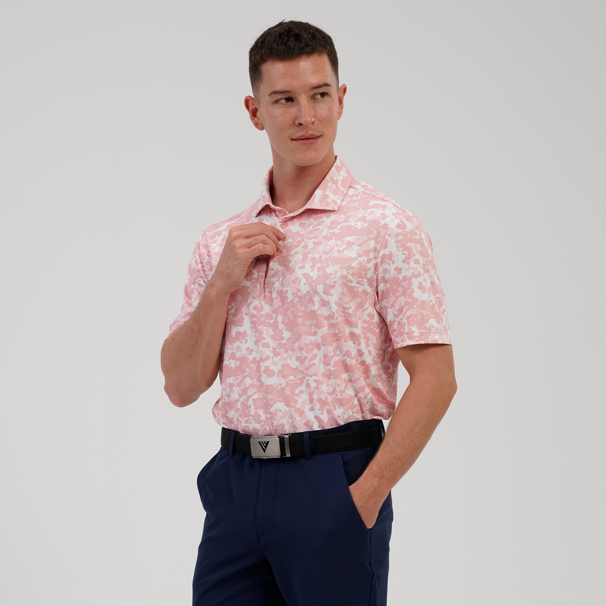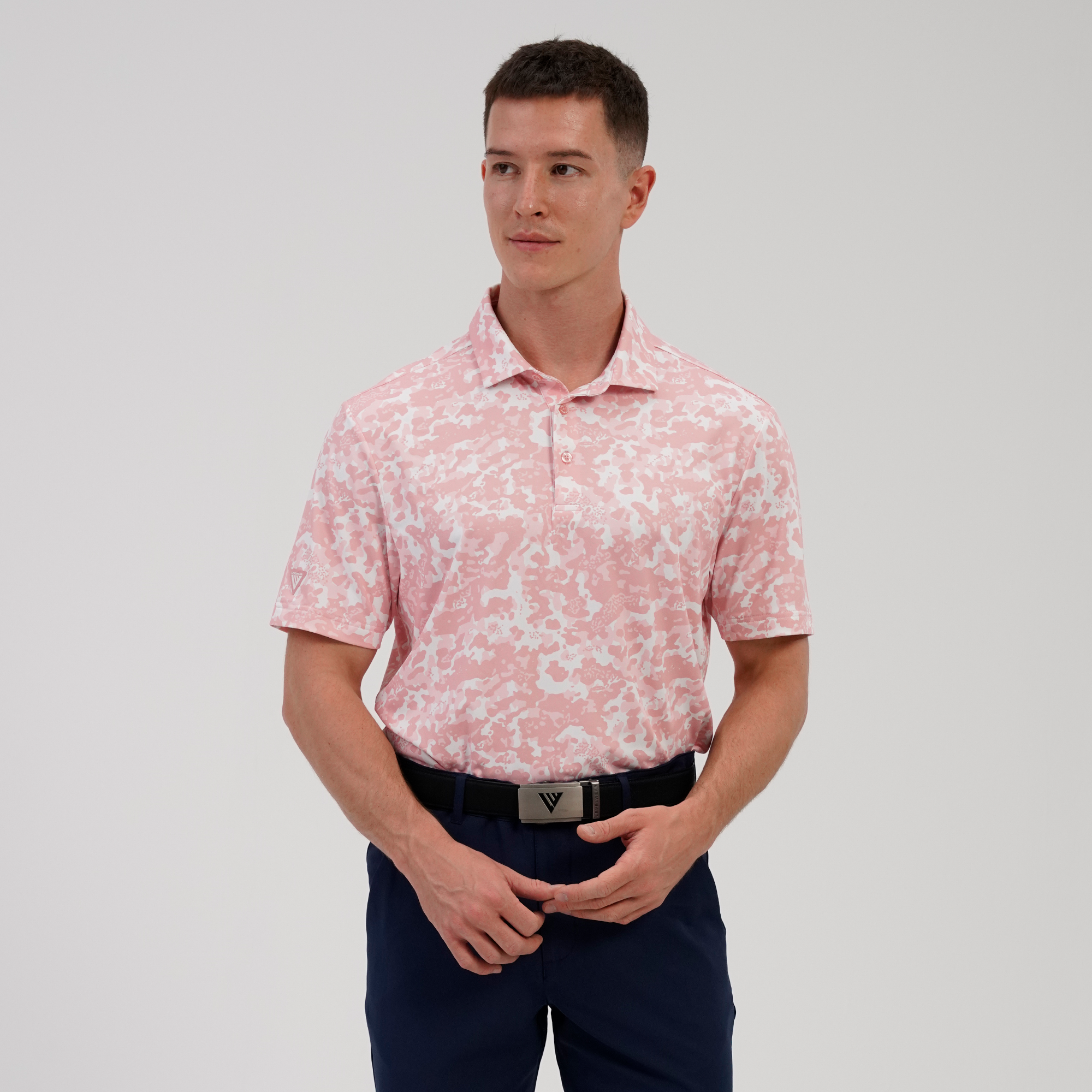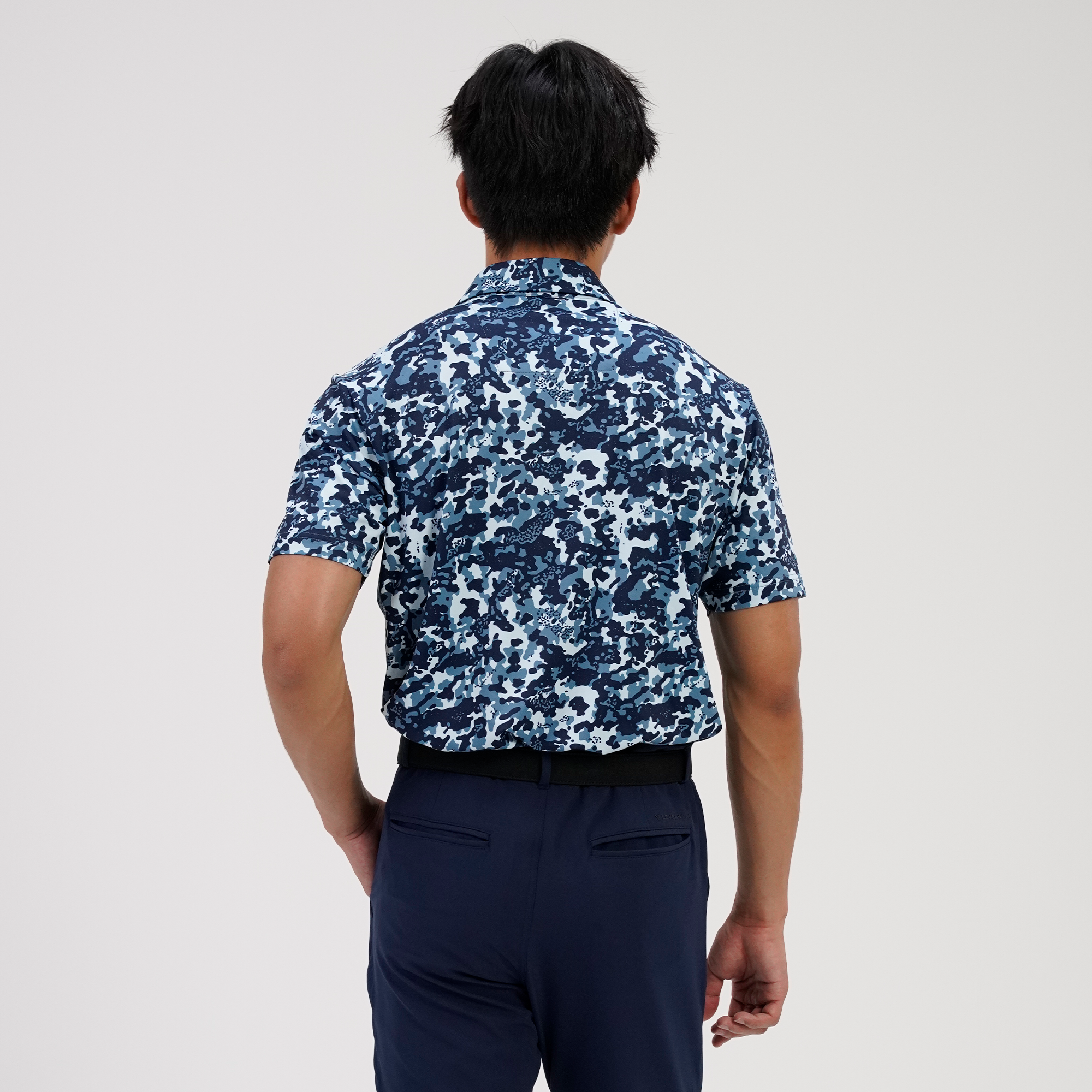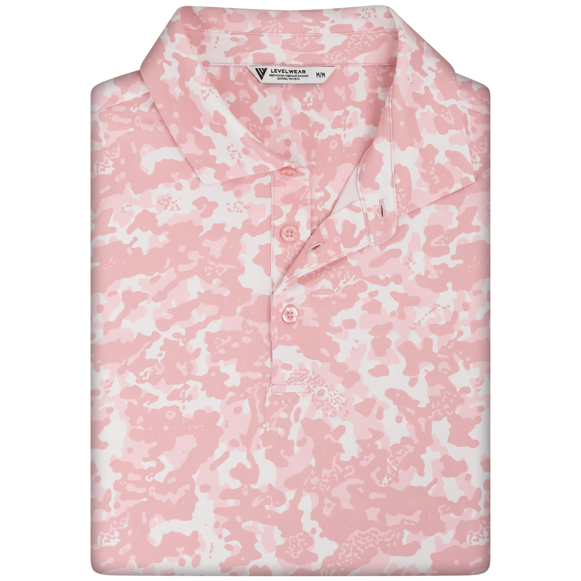 The Camo polo delivers all-day performance with moisture-wicking fabric and UPF 50+ sun protection. Designed with a contrast collar and built-in collar stay for a clean finish, plus forward shoulder seams for better mobility. The high-low hem with side slits offers added coverage and ease of movement, while the all-over camo print adds a bold, athletic edge.