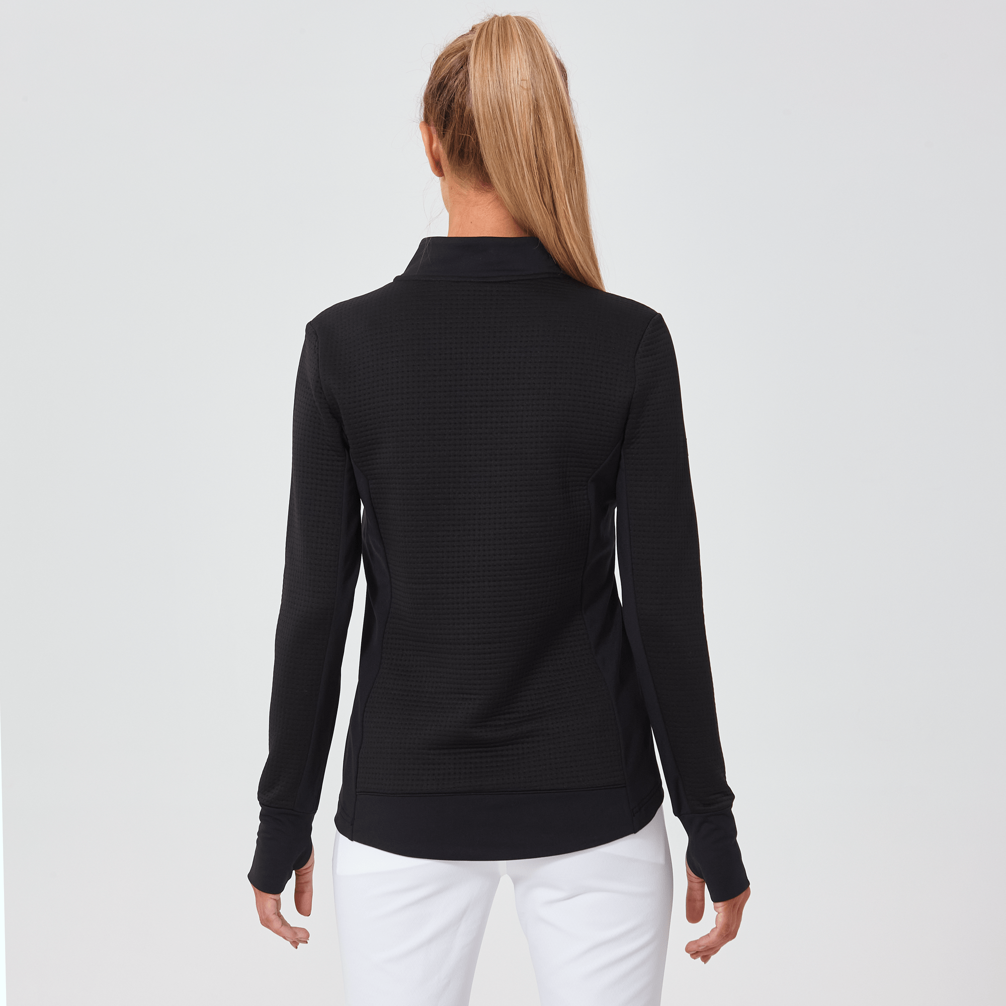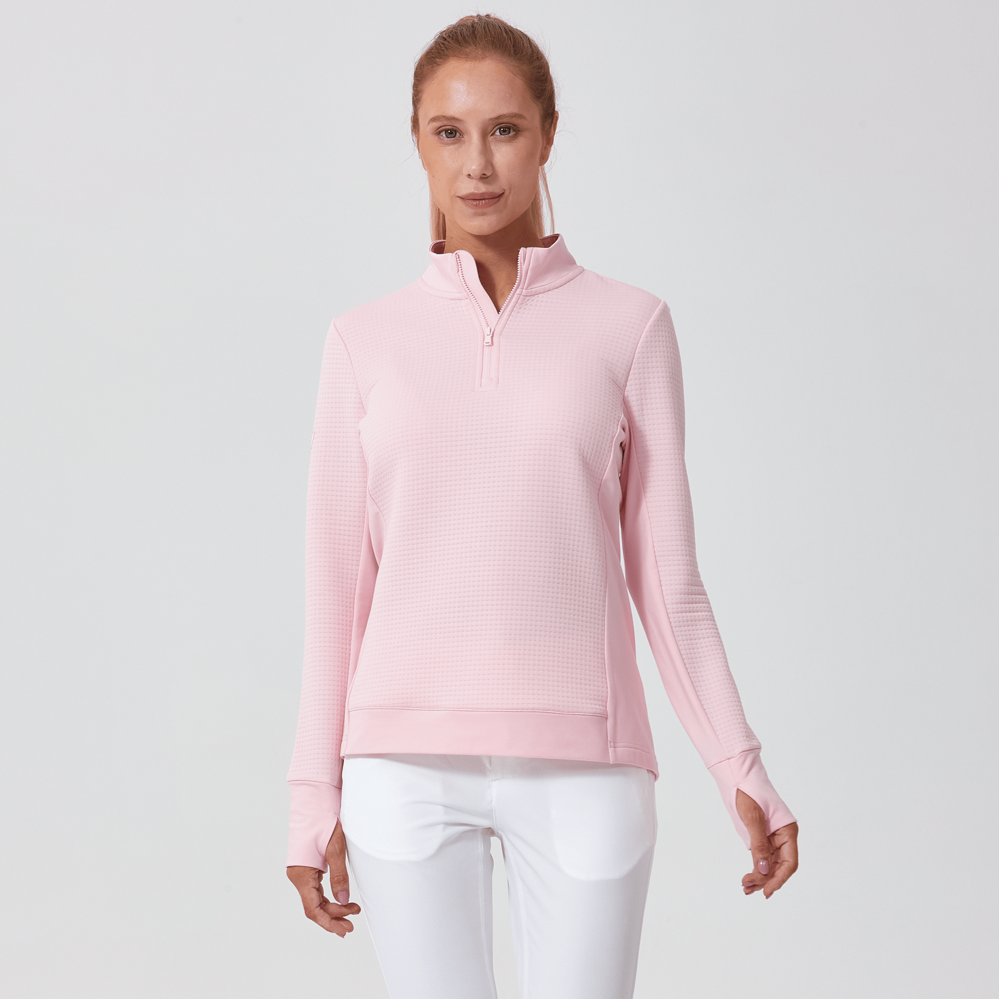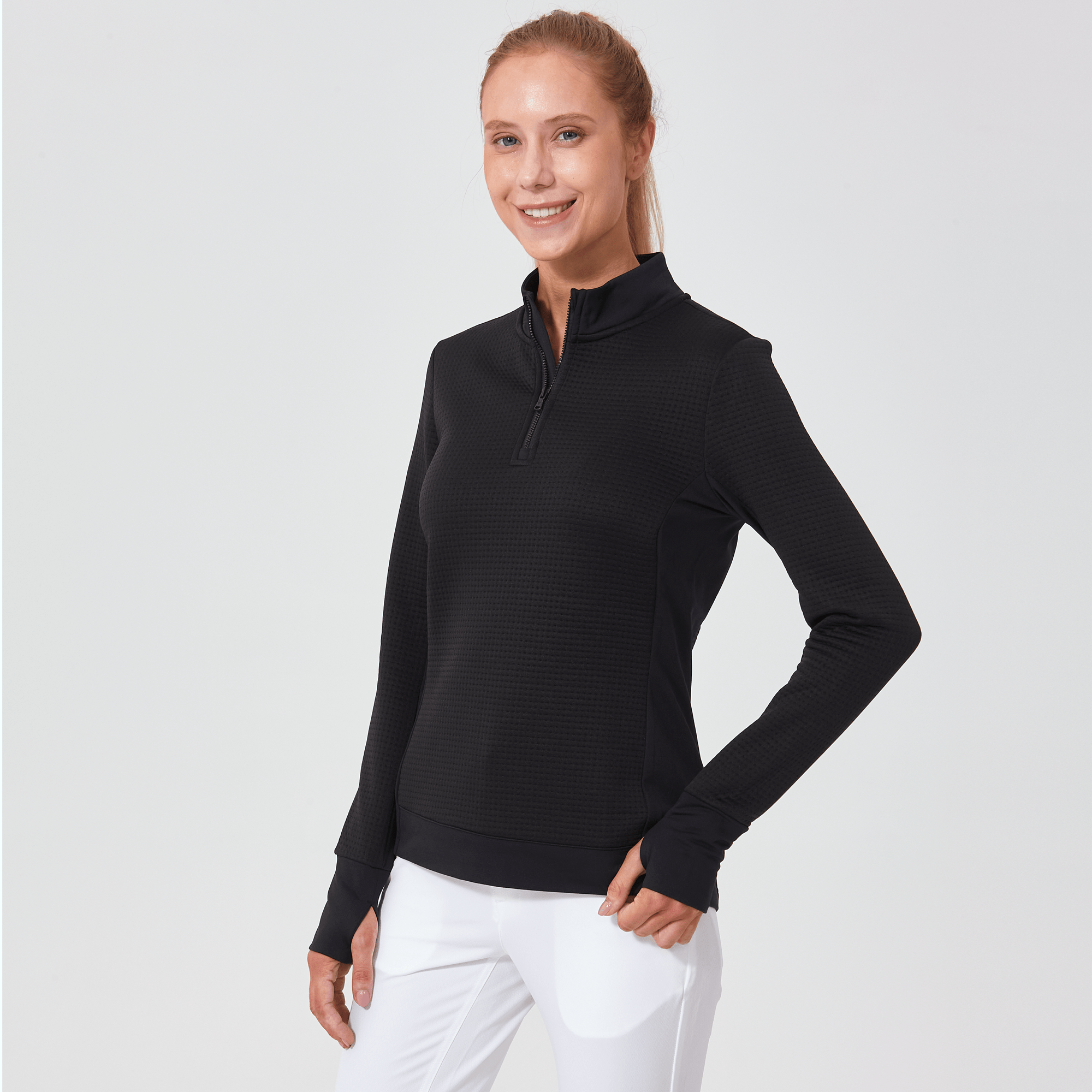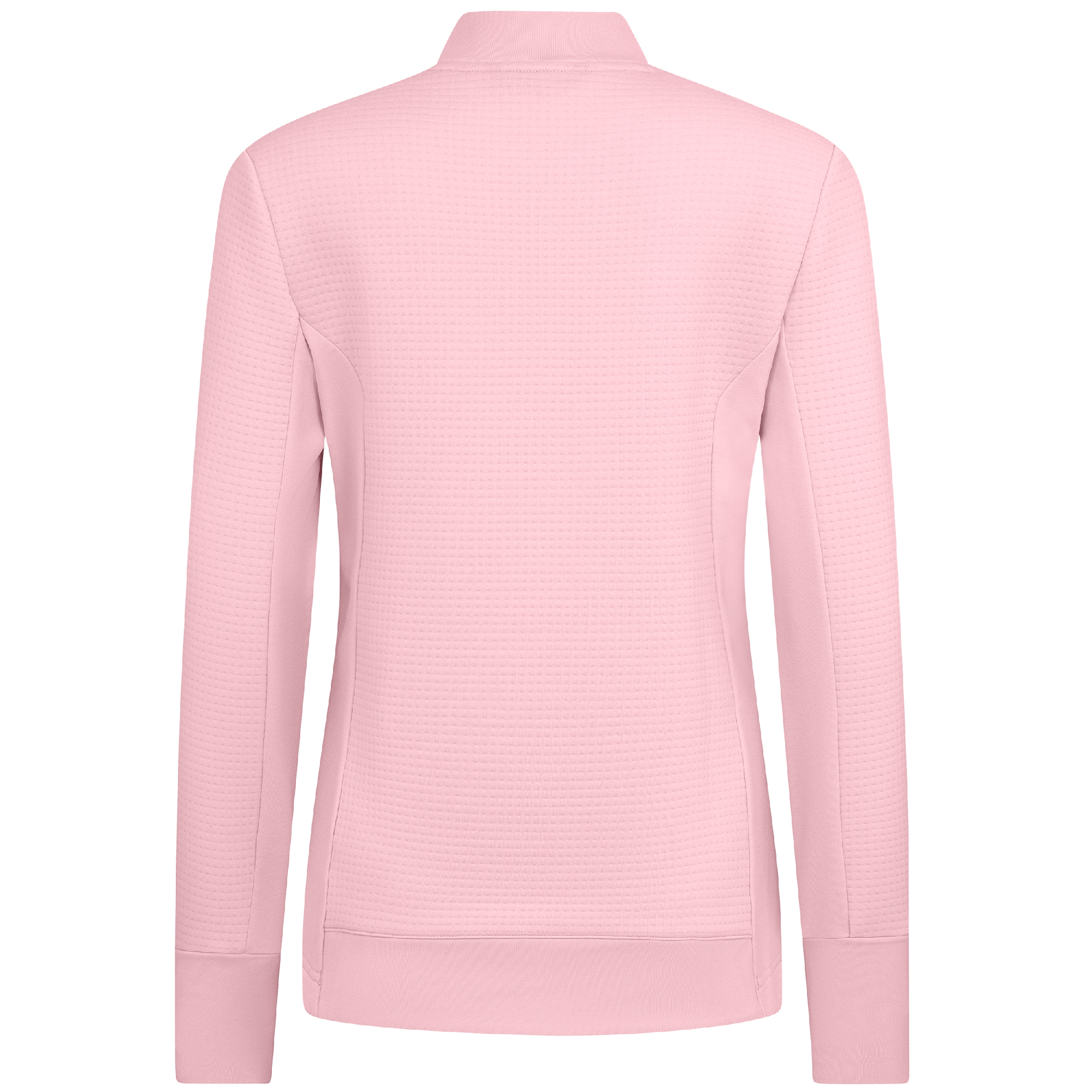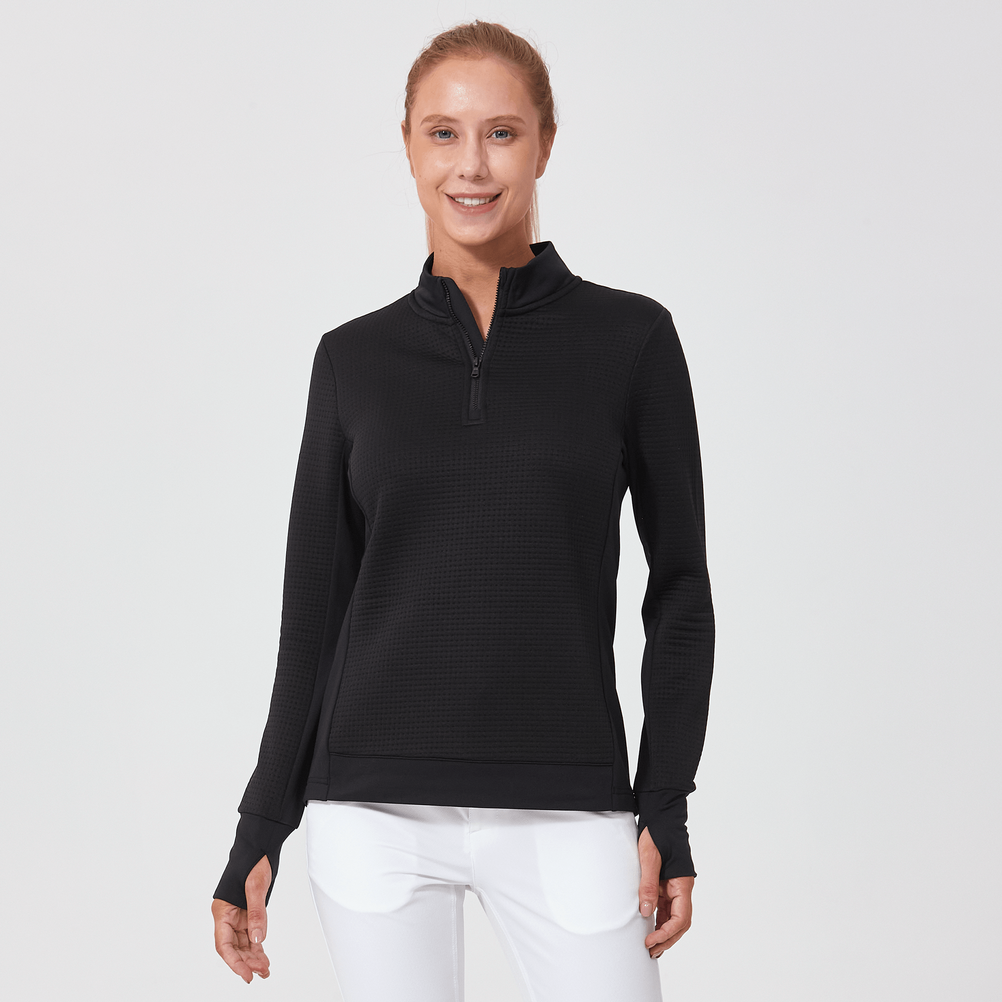 Meet the women's Cushion Quarter-Zip, meticulously crafted to meet the demands of active lifestyles. This top is made from 100% polyester jacquard fabric, which not only provides a unique texture but also brings essential performance features such as moisture-wicking to keep you dry, anti-static to reduce cling, and anti-pilling to ensure a smooth appearance over time. The quarter-zip design features a stand-up collar for adjustable coverage and style, while the thumbholes on the cuffs offer extra warmth and keep sleeves securely in place. Aesthetic contrasts in the solid collar, side panels, cuffs, and hem enhance the visual appeal and define the silhouette. Finished with a high-low hem for added coverage, the Cushion quarter-zip is an excellent choice for those seeking a functional yet stylish garment for outdoor activities, workouts, golf or casual wear.