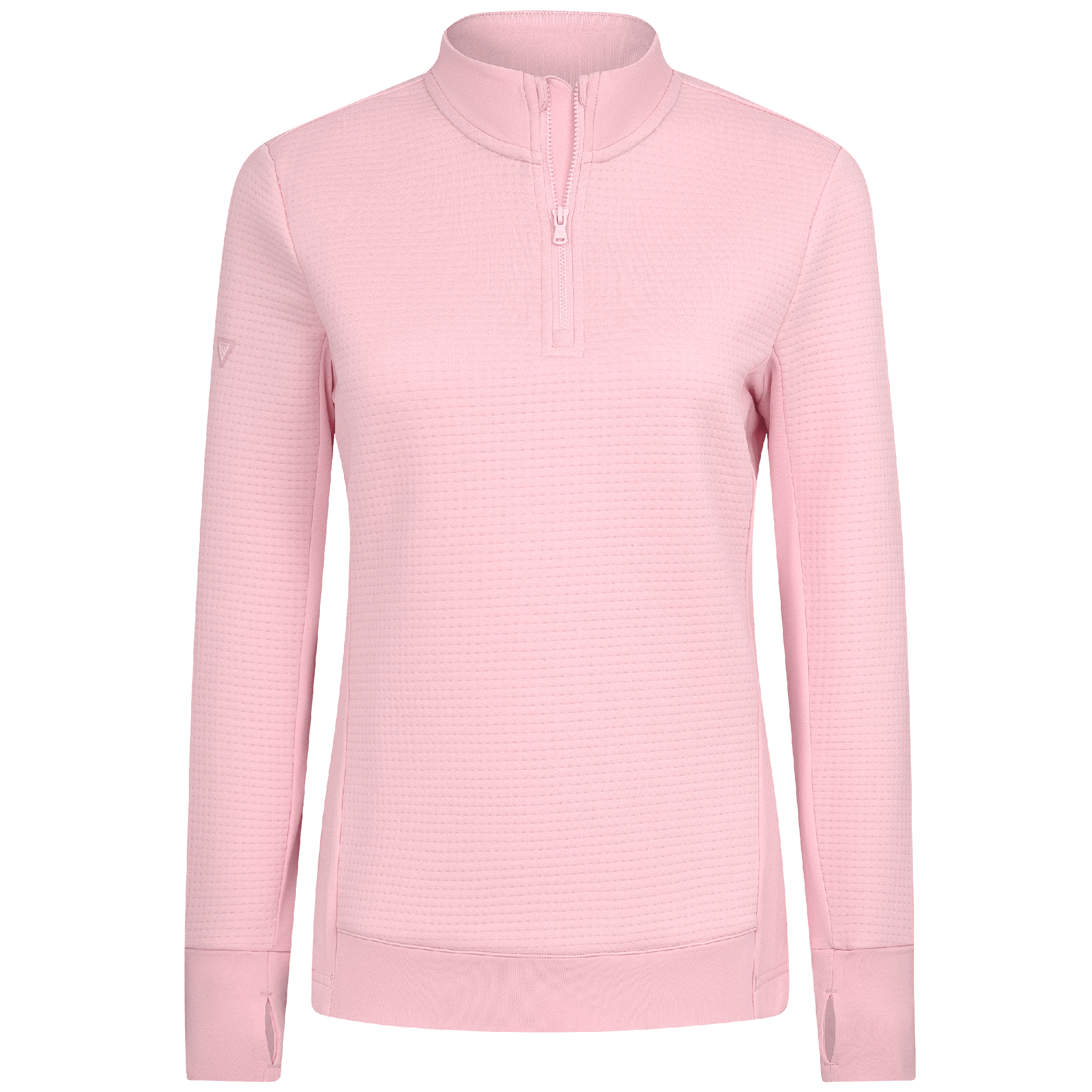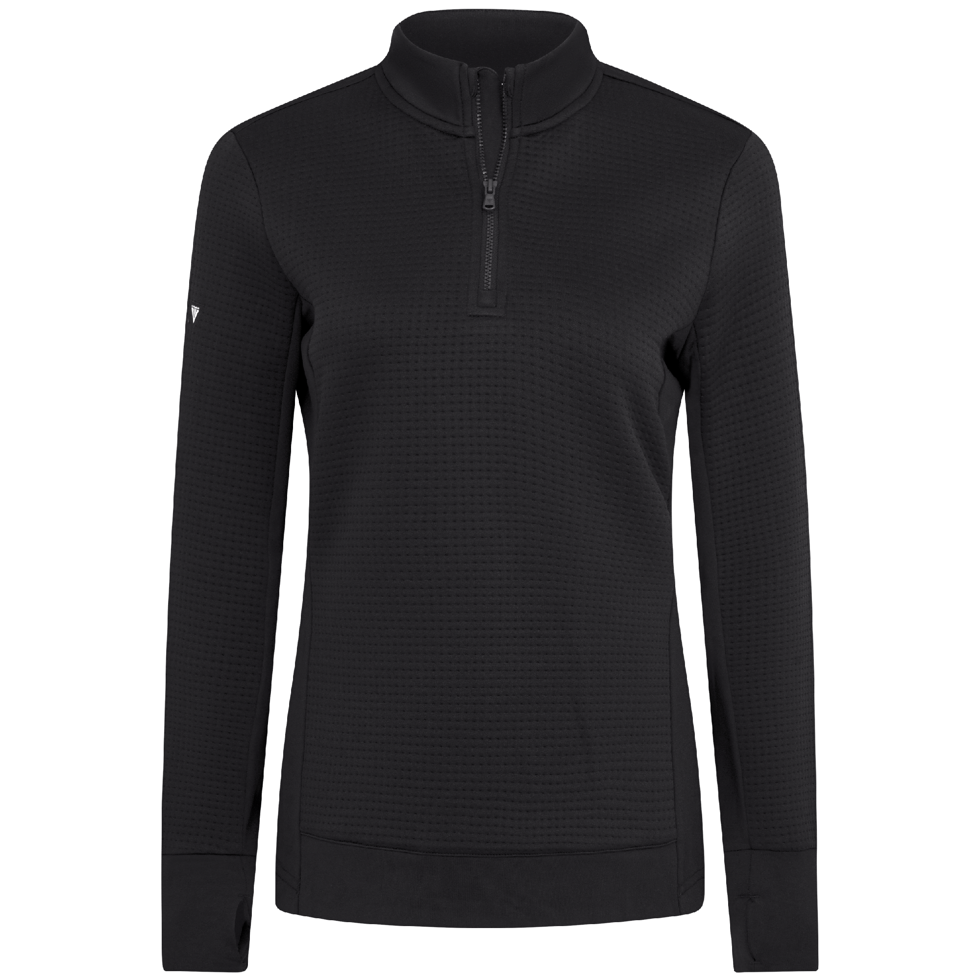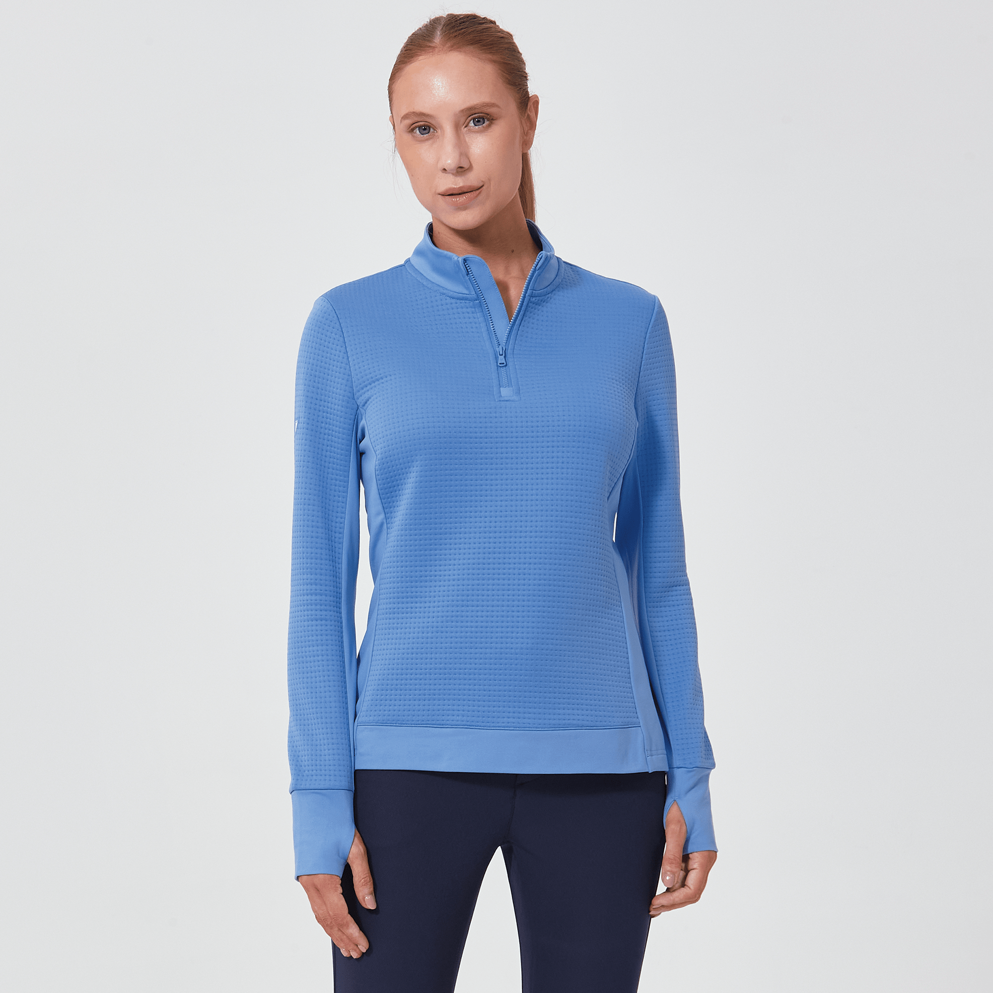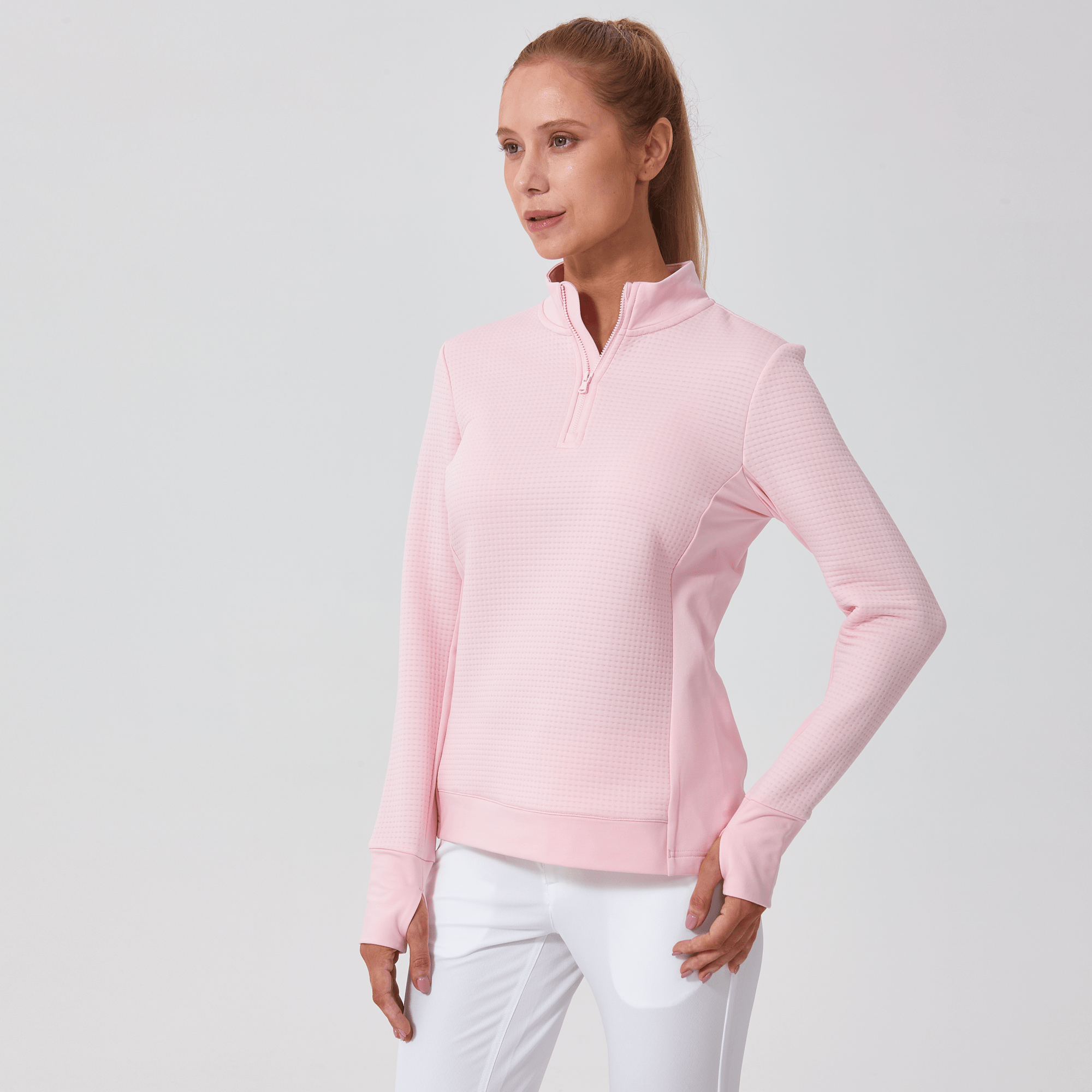 Meet the women's Cushion Quarter-Zip, meticulously crafted to meet the demands of active lifestyles. This top is made from 100% polyester jacquard fabric, which not only provides a unique texture but also brings essential performance features such as moisture-wicking to keep you dry, anti-static to reduce cling, and anti-pilling to ensure a smooth appearance over time. The quarter-zip design features a stand-up collar for adjustable coverage and style, while the thumbholes on the cuffs offer extra warmth and keep sleeves securely in place. Aesthetic contrasts in the solid collar, side panels, cuffs, and hem enhance the visual appeal and define the silhouette. Finished with a high-low hem for added coverage, the Cushion quarter-zip is an excellent choice for those seeking a functional yet stylish garment for outdoor activities, workouts, golf or casual wear.
