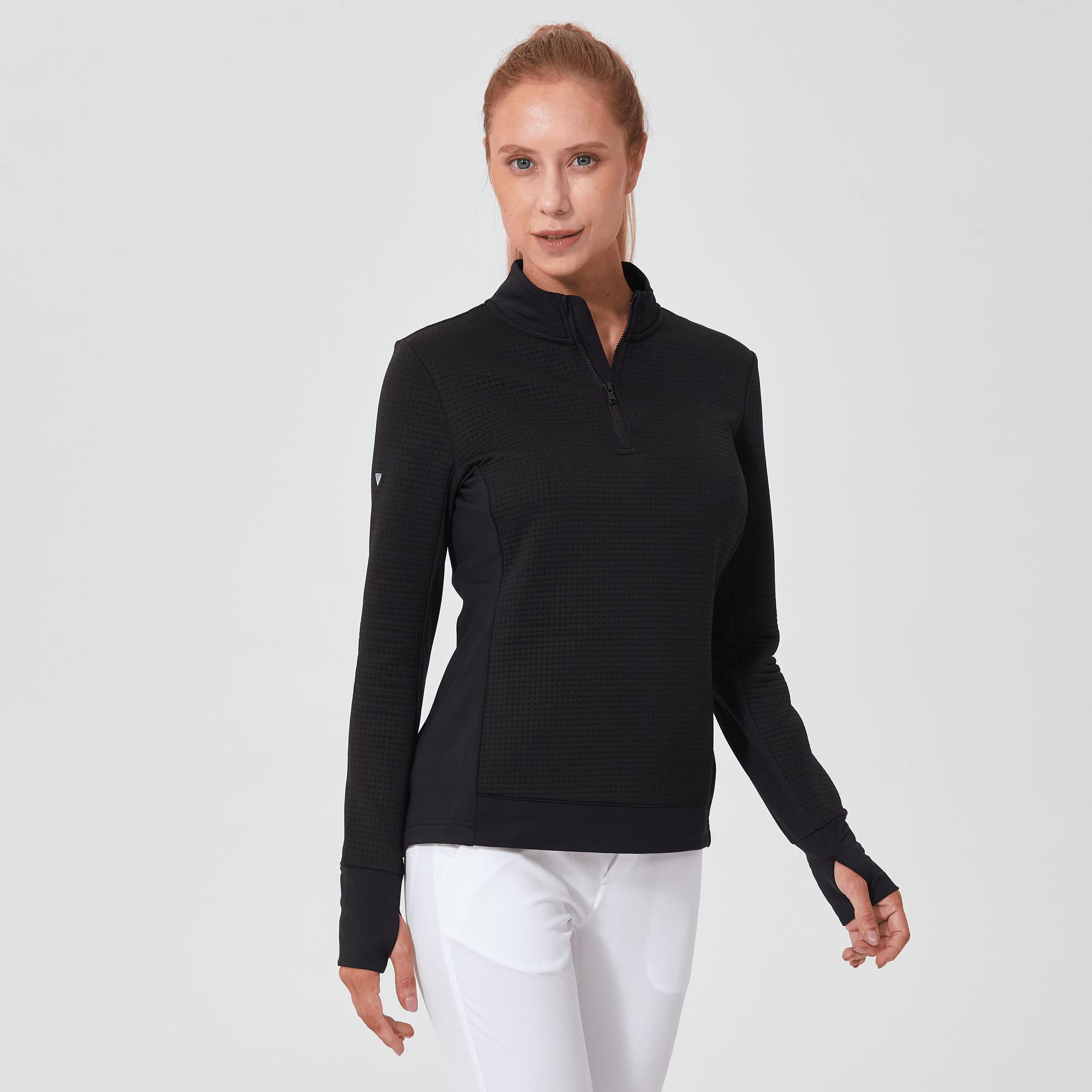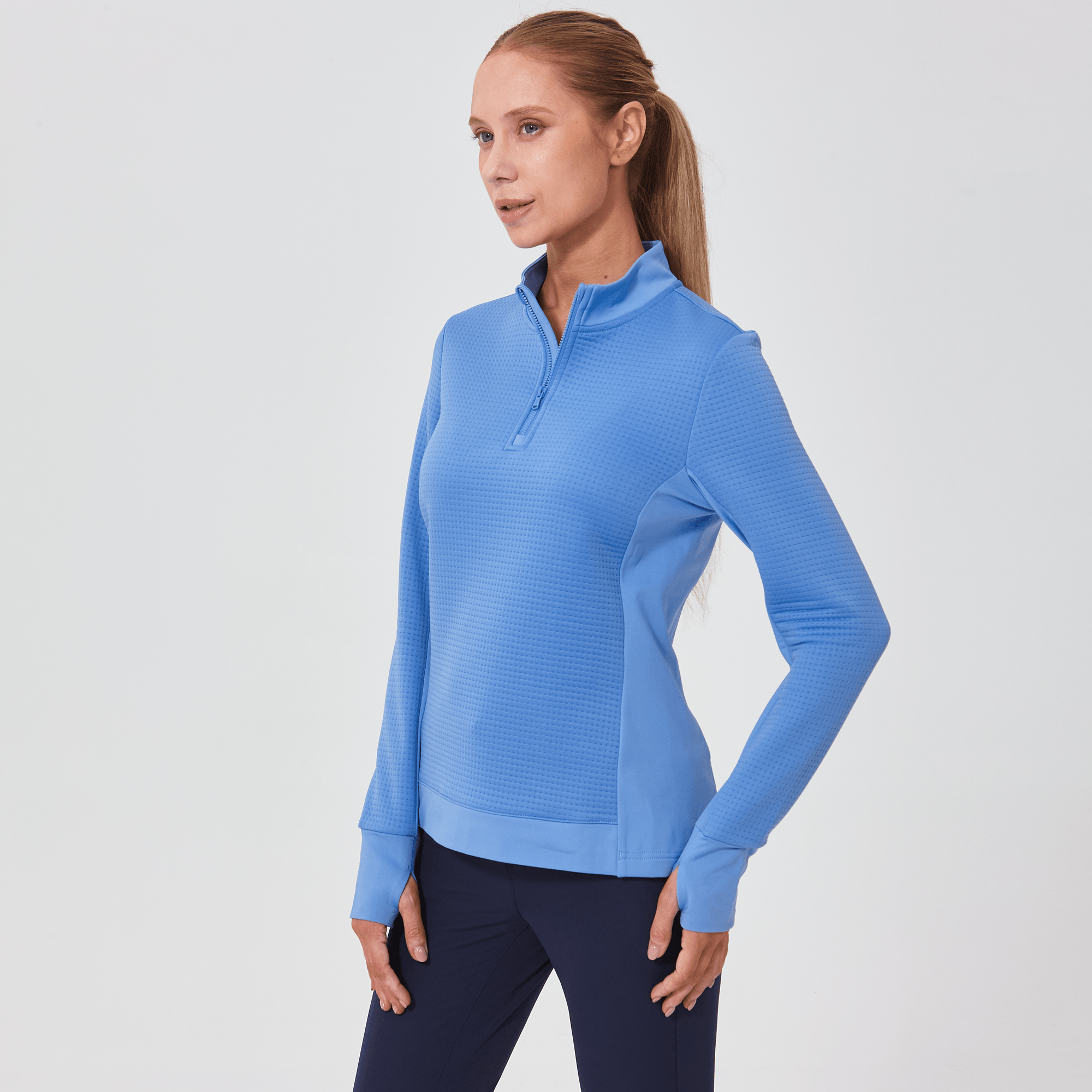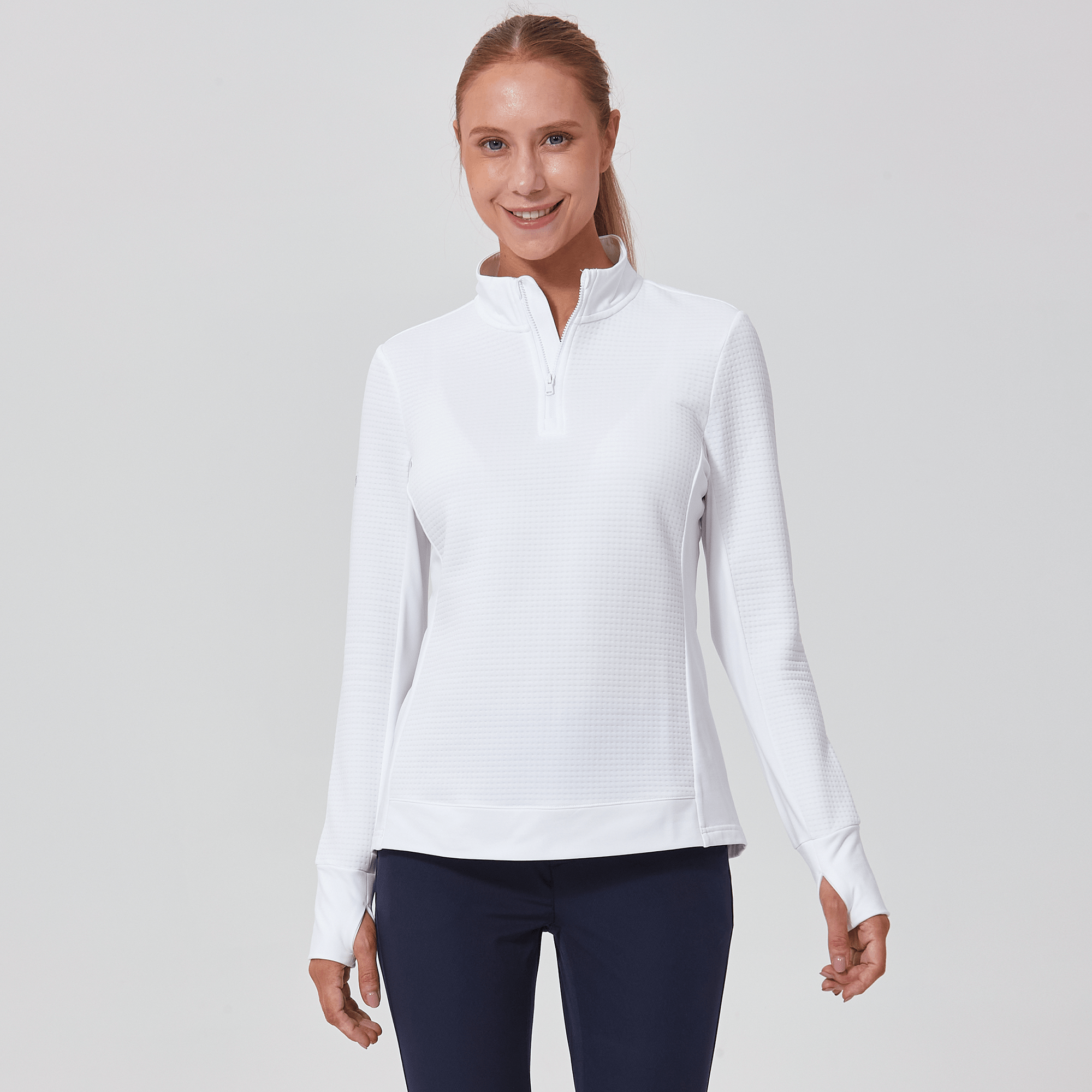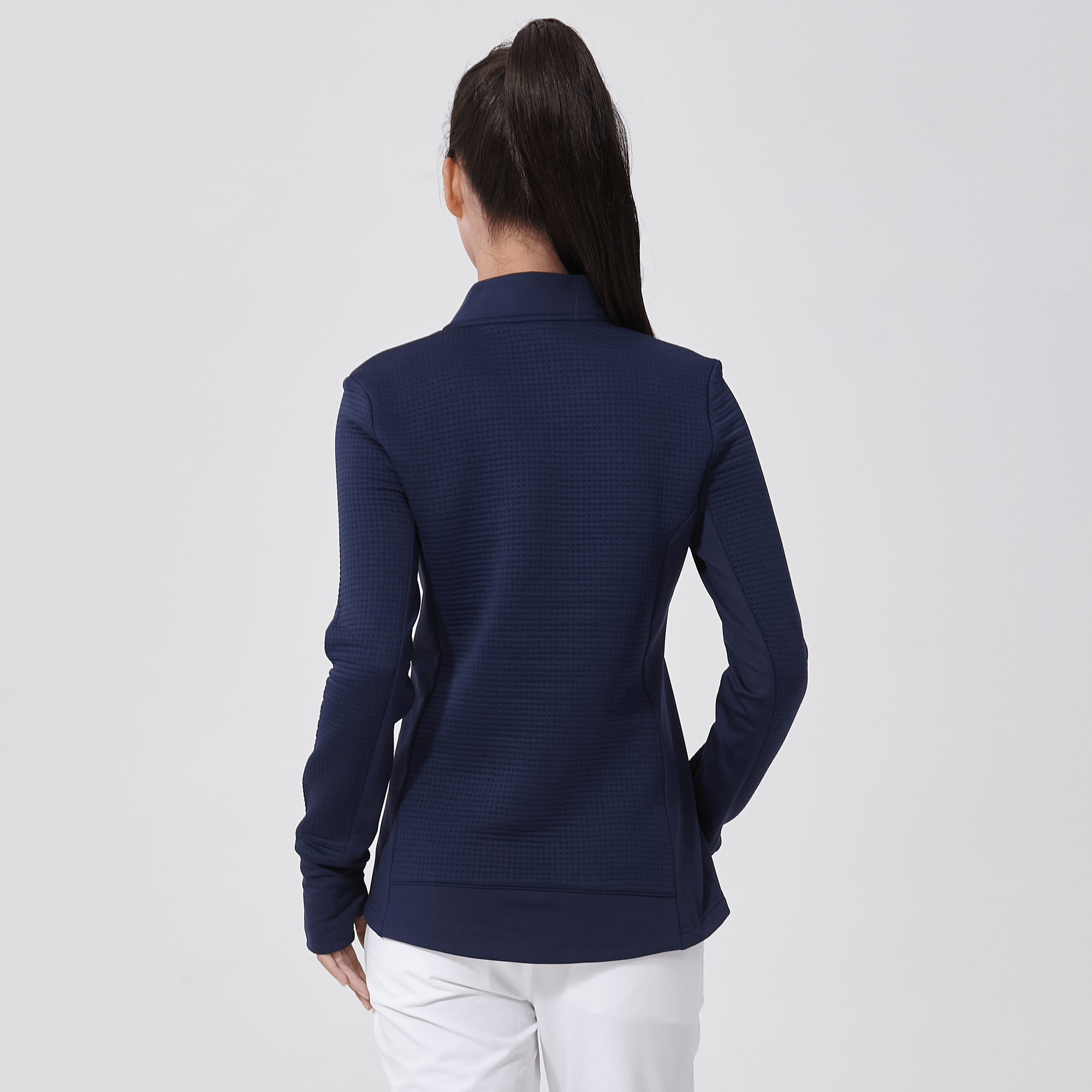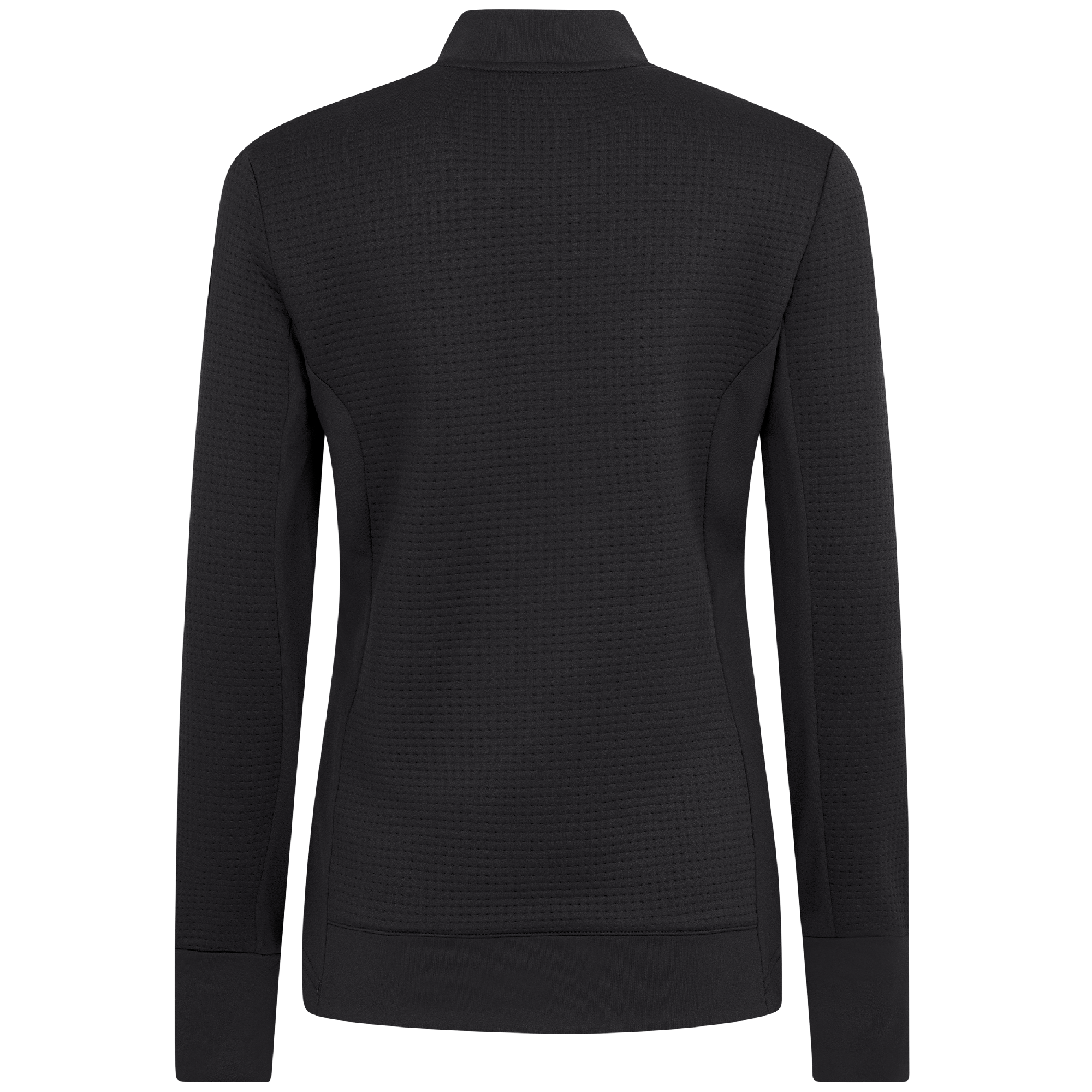 Meet the women's Cushion Quarter-Zip, meticulously crafted to meet the demands of active lifestyles. This top is made from 100% polyester jacquard fabric, which not only provides a unique texture but also brings essential performance features such as moisture-wicking to keep you dry, anti-static to reduce cling, and anti-pilling to ensure a smooth appearance over time. The quarter-zip design features a stand-up collar for adjustable coverage and style, while the thumbholes on the cuffs offer extra warmth and keep sleeves securely in place. Aesthetic contrasts in the solid collar, side panels, cuffs, and hem enhance the visual appeal and define the silhouette. Finished with a high-low hem for added coverage, the Cushion quarter-zip is an excellent choice for those seeking a functional yet stylish garment for outdoor activities, workouts, golf or casual wear.