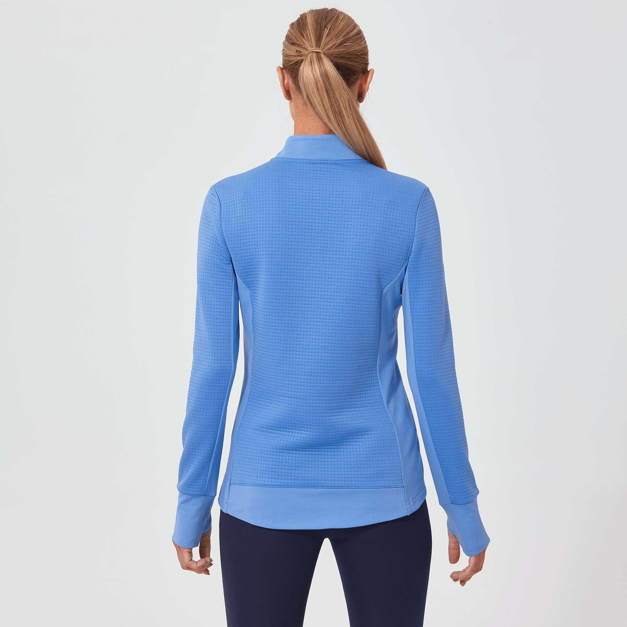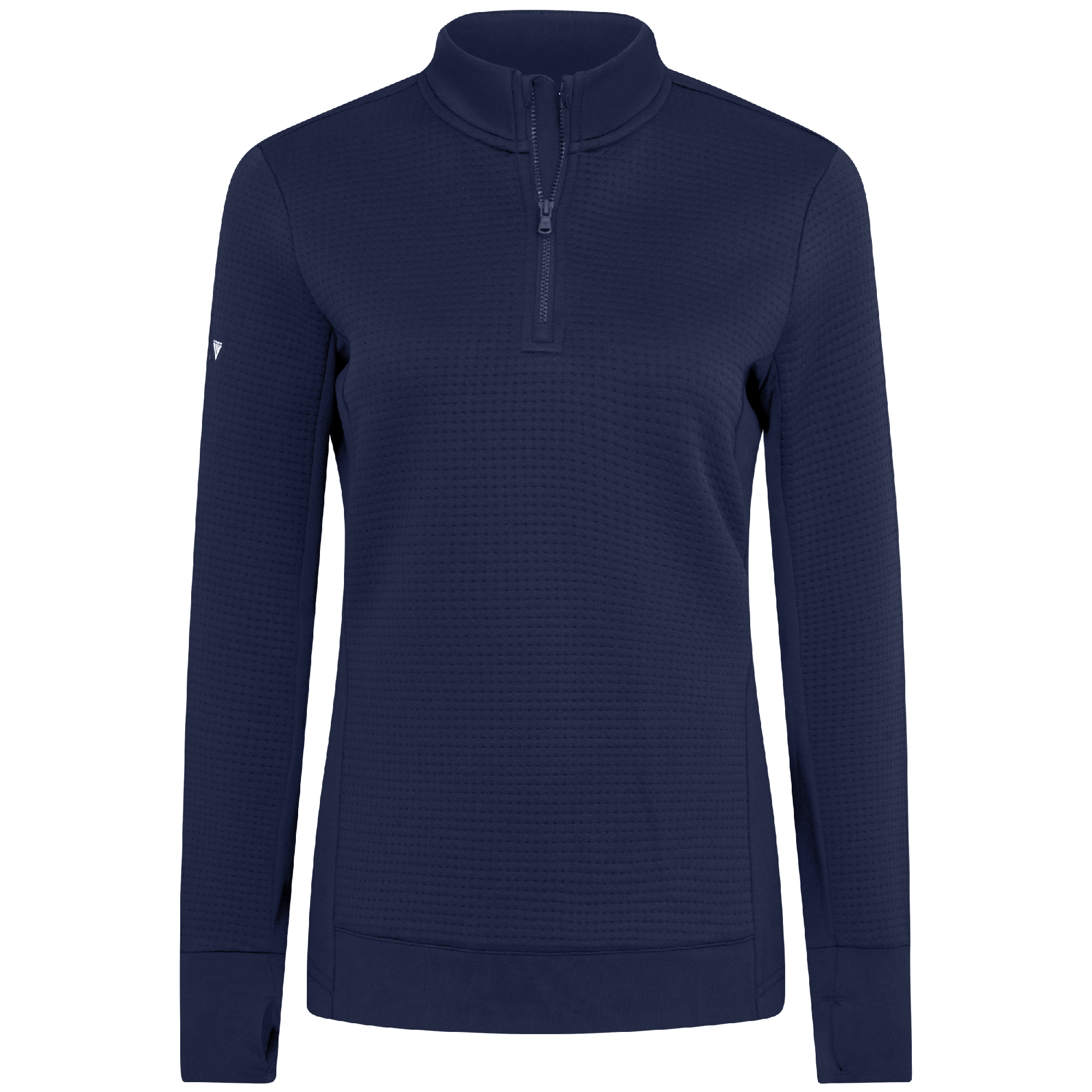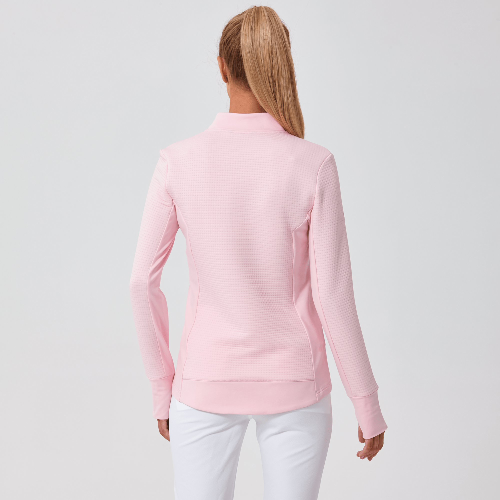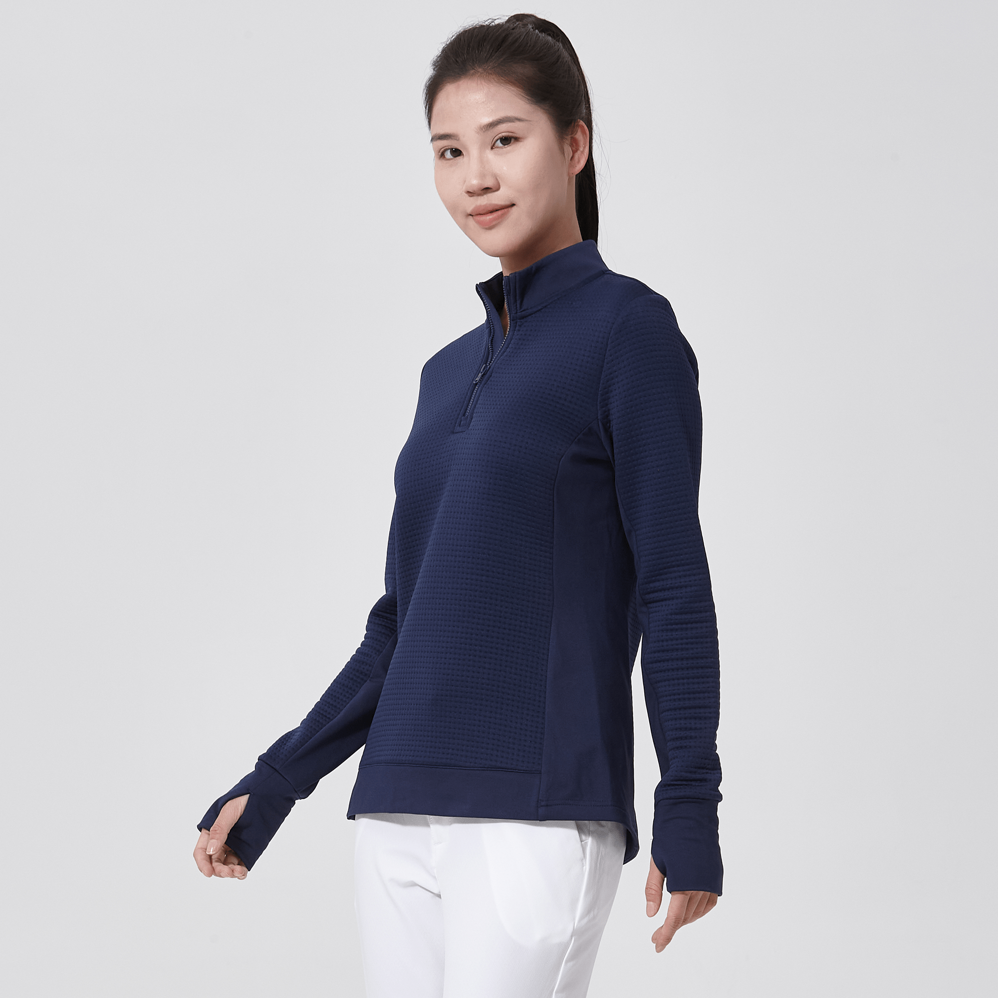 Meet the women's Cushion Quarter-Zip, meticulously crafted to meet the demands of active lifestyles. This top is made from 100% polyester jacquard fabric, which not only provides a unique texture but also brings essential performance features such as moisture-wicking to keep you dry, anti-static to reduce cling, and anti-pilling to ensure a smooth appearance over time. The quarter-zip design features a stand-up collar for adjustable coverage and style, while the thumbholes on the cuffs offer extra warmth and keep sleeves securely in place. Aesthetic contrasts in the solid collar, side panels, cuffs, and hem enhance the visual appeal and define the silhouette. Finished with a high-low hem for added coverage, the Cushion quarter-zip is an excellent choice for those seeking a functional yet stylish garment for outdoor activities, workouts, golf or casual wear.