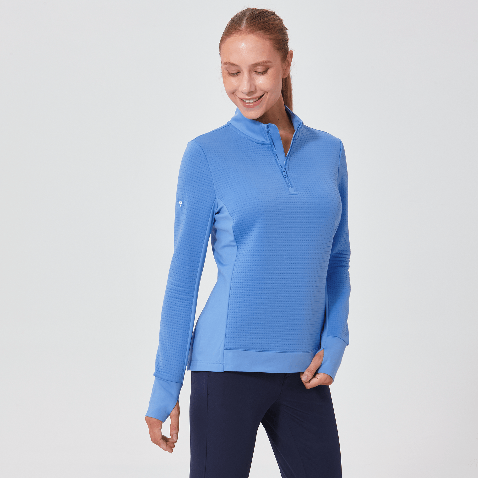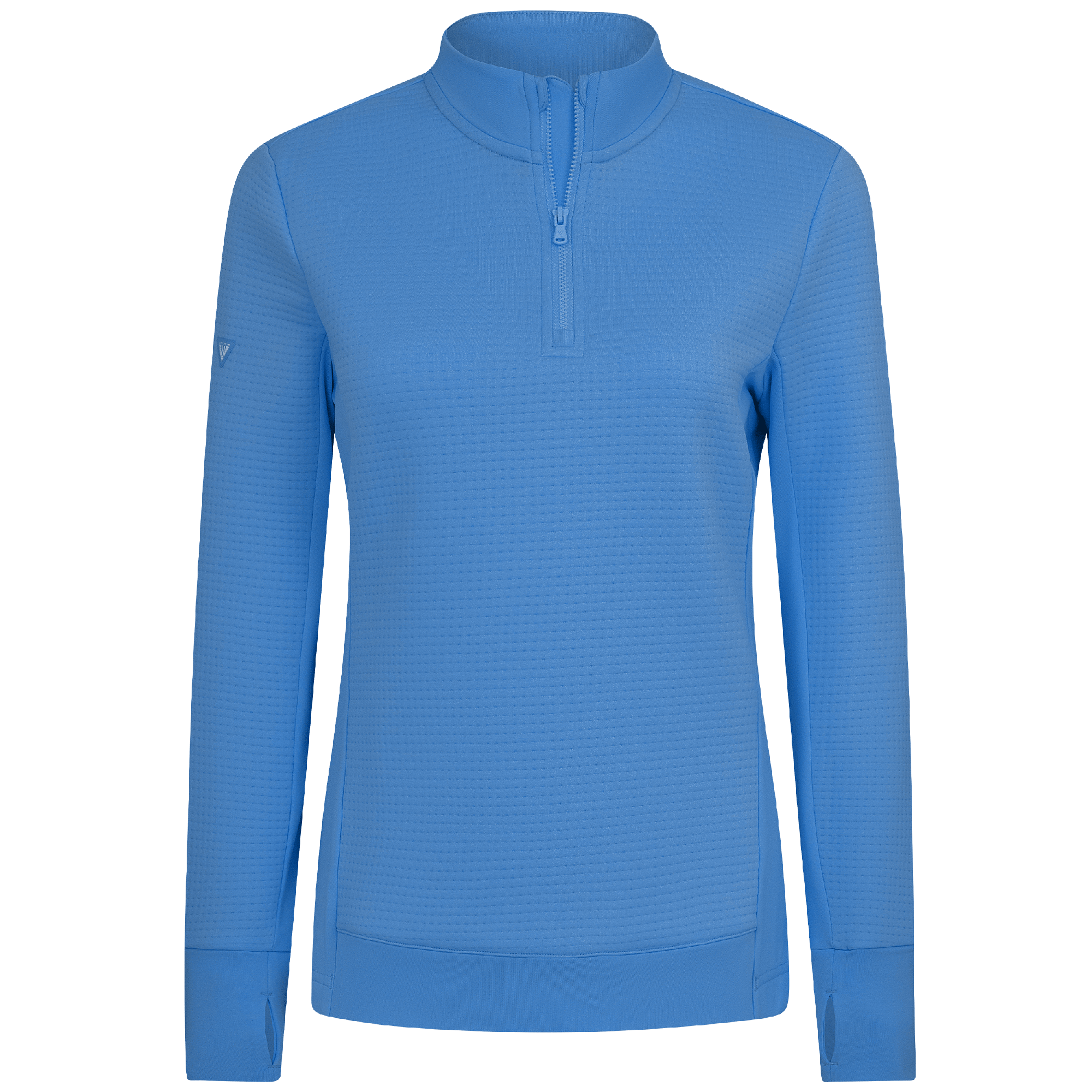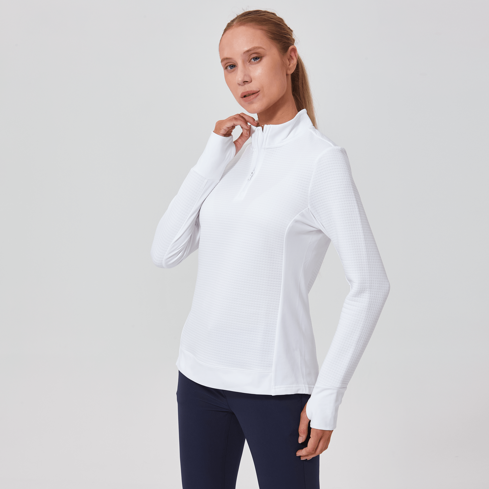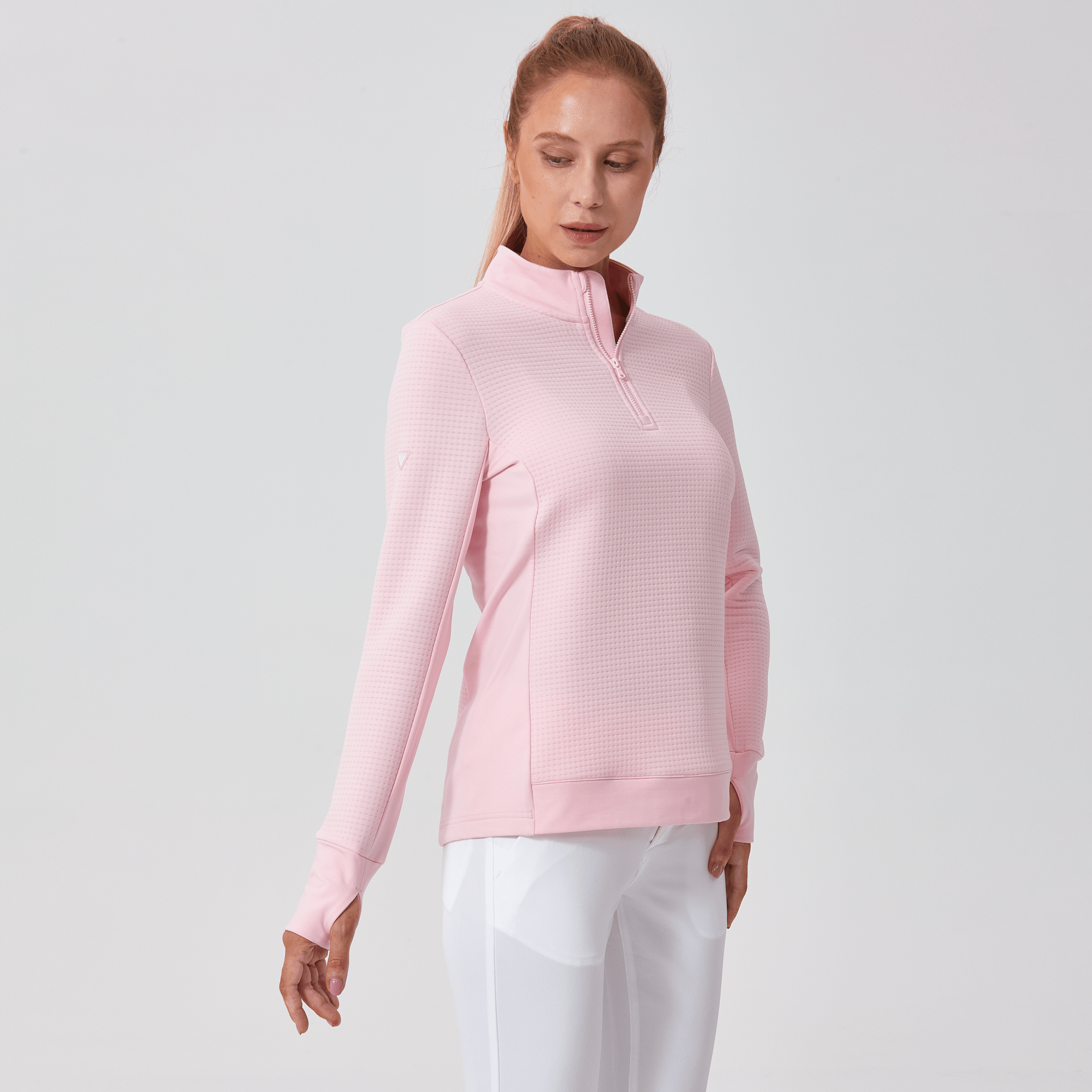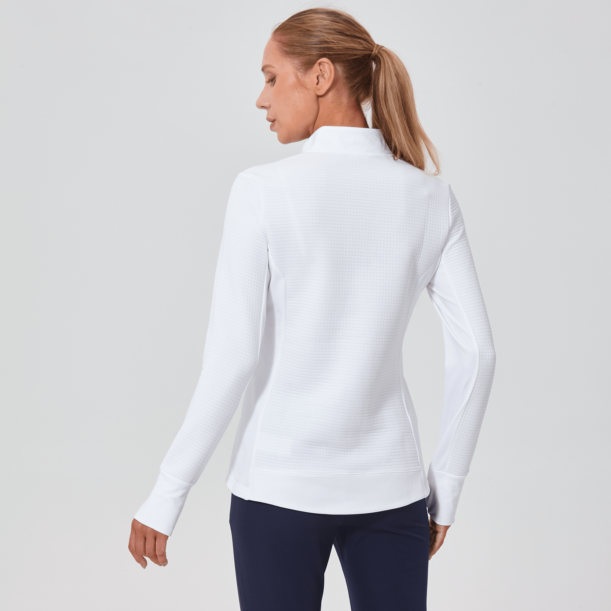 Meet the women's Cushion Quarter-Zip, meticulously crafted to meet the demands of active lifestyles. This top is made from 100% polyester jacquard fabric, which not only provides a unique texture but also brings essential performance features such as moisture-wicking to keep you dry, anti-static to reduce cling, and anti-pilling to ensure a smooth appearance over time. The quarter-zip design features a stand-up collar for adjustable coverage and style, while the thumbholes on the cuffs offer extra warmth and keep sleeves securely in place. Aesthetic contrasts in the solid collar, side panels, cuffs, and hem enhance the visual appeal and define the silhouette. Finished with a high-low hem for added coverage, the Cushion quarter-zip is an excellent choice for those seeking a functional yet stylish garment for outdoor activities, workouts, golf or casual wear.