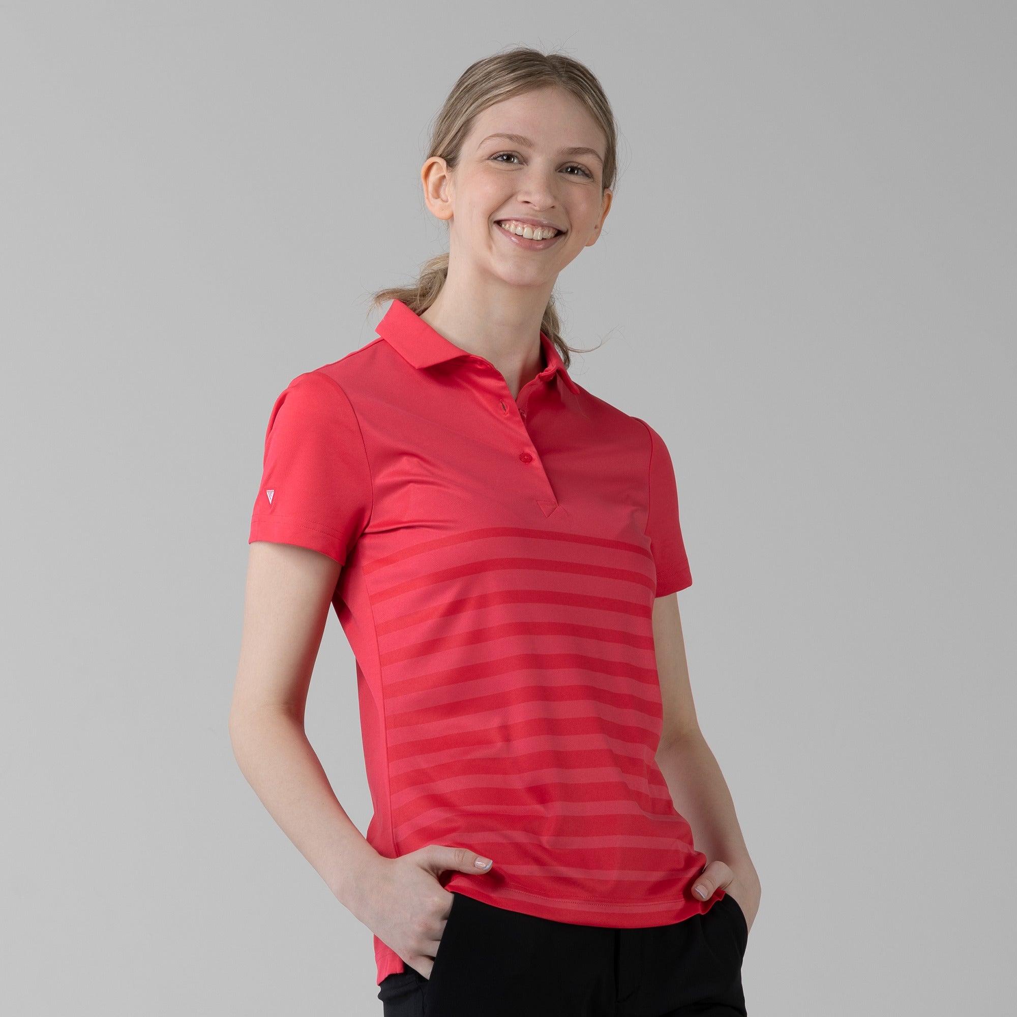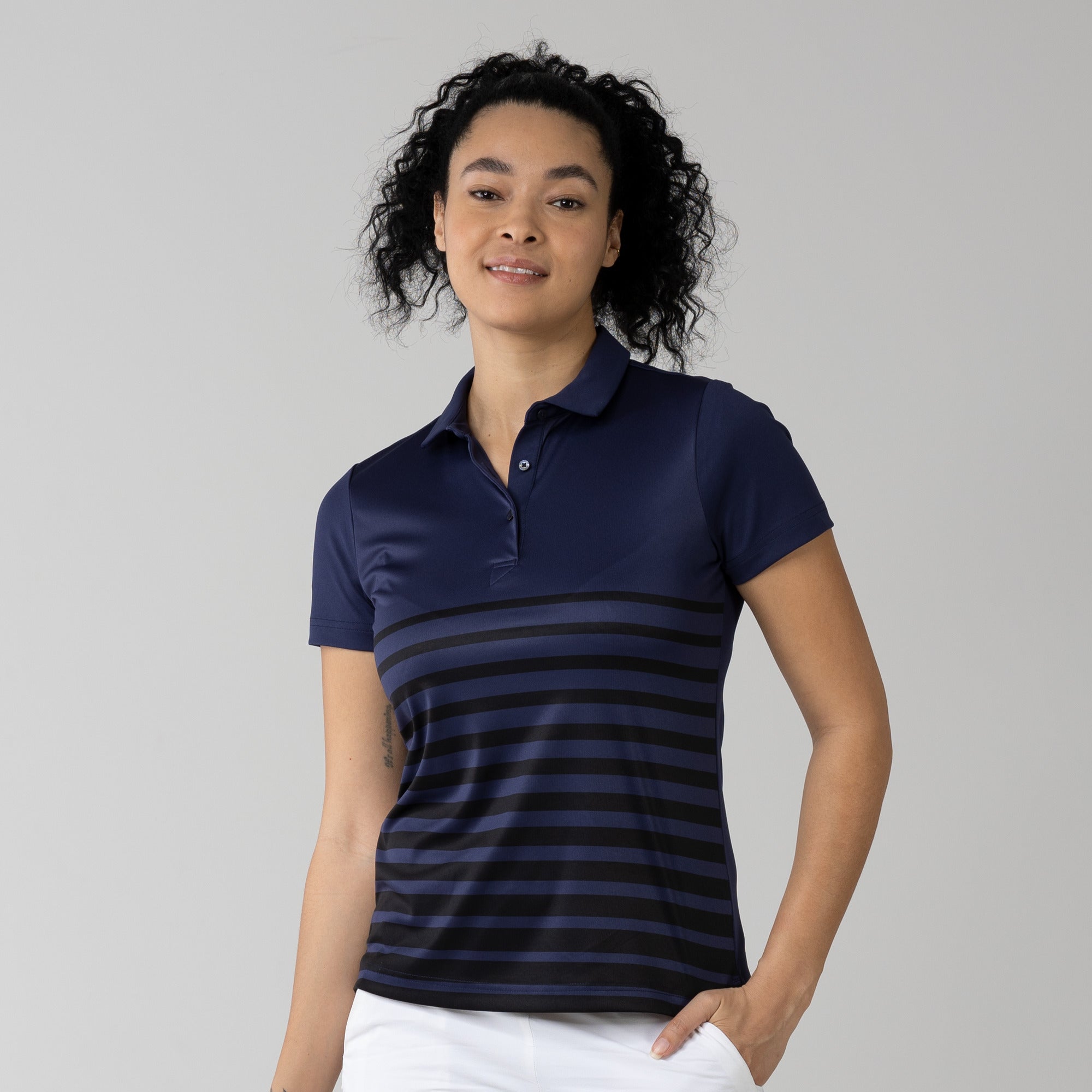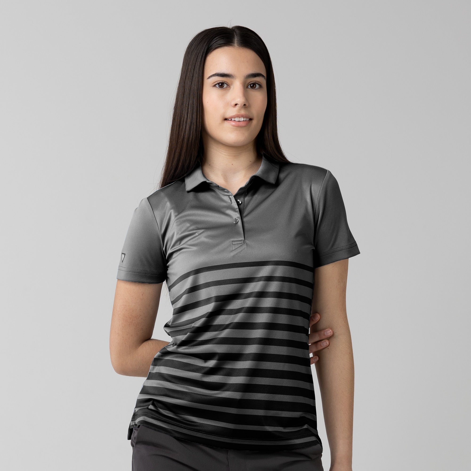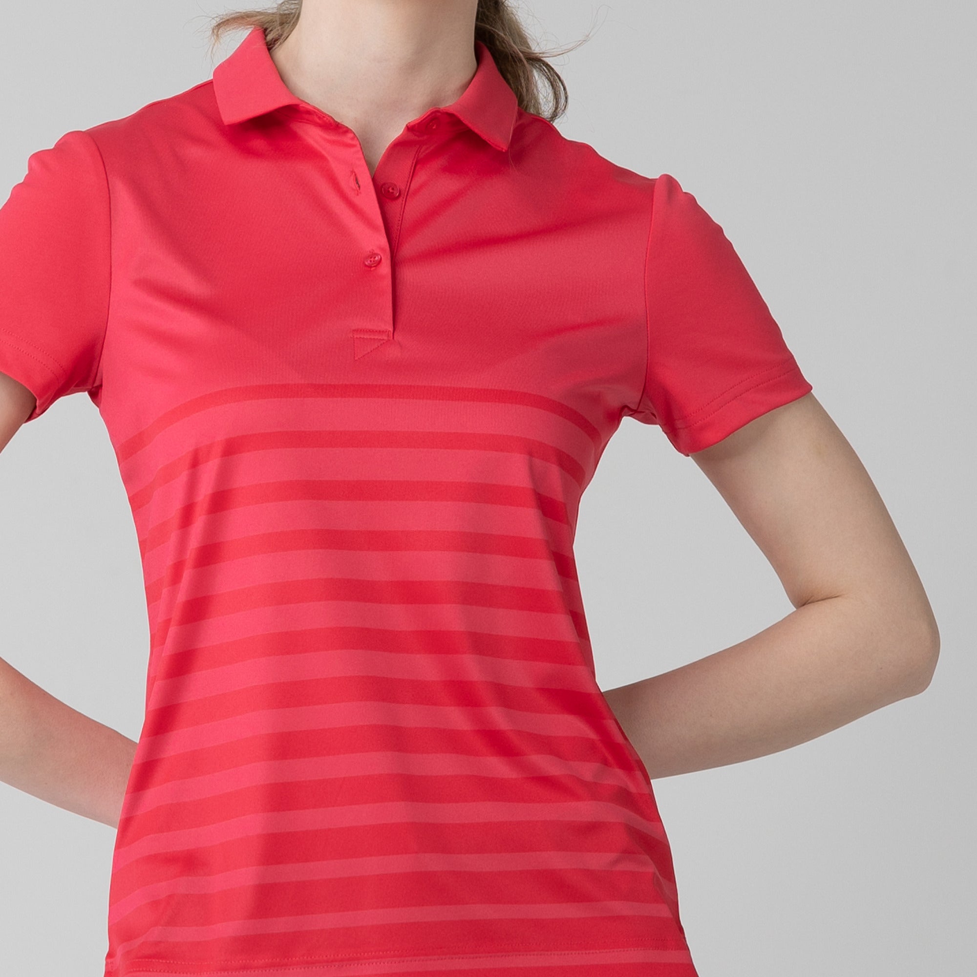 The women's Tone polo is expertly crafted for golf enthusiasts who value both function and style on the course. Made entirely from 100% polyester, this polo is equipped with moisture-wicking properties to keep you comfortably dry, anti-static technology to eliminate cling, and mechanical stretch fabric that moves with you as you swing. It features a smart self-fabric collar for a refined look, and the high-low hem with side slits offers enhanced mobility and a flattering silhouette, ideal for dynamic movement during play. Perfect for a day on the greens or a casual clubhouse gathering, the Tone polo combines performance-driven features with sleek design to ensure you're always at the top of your game.